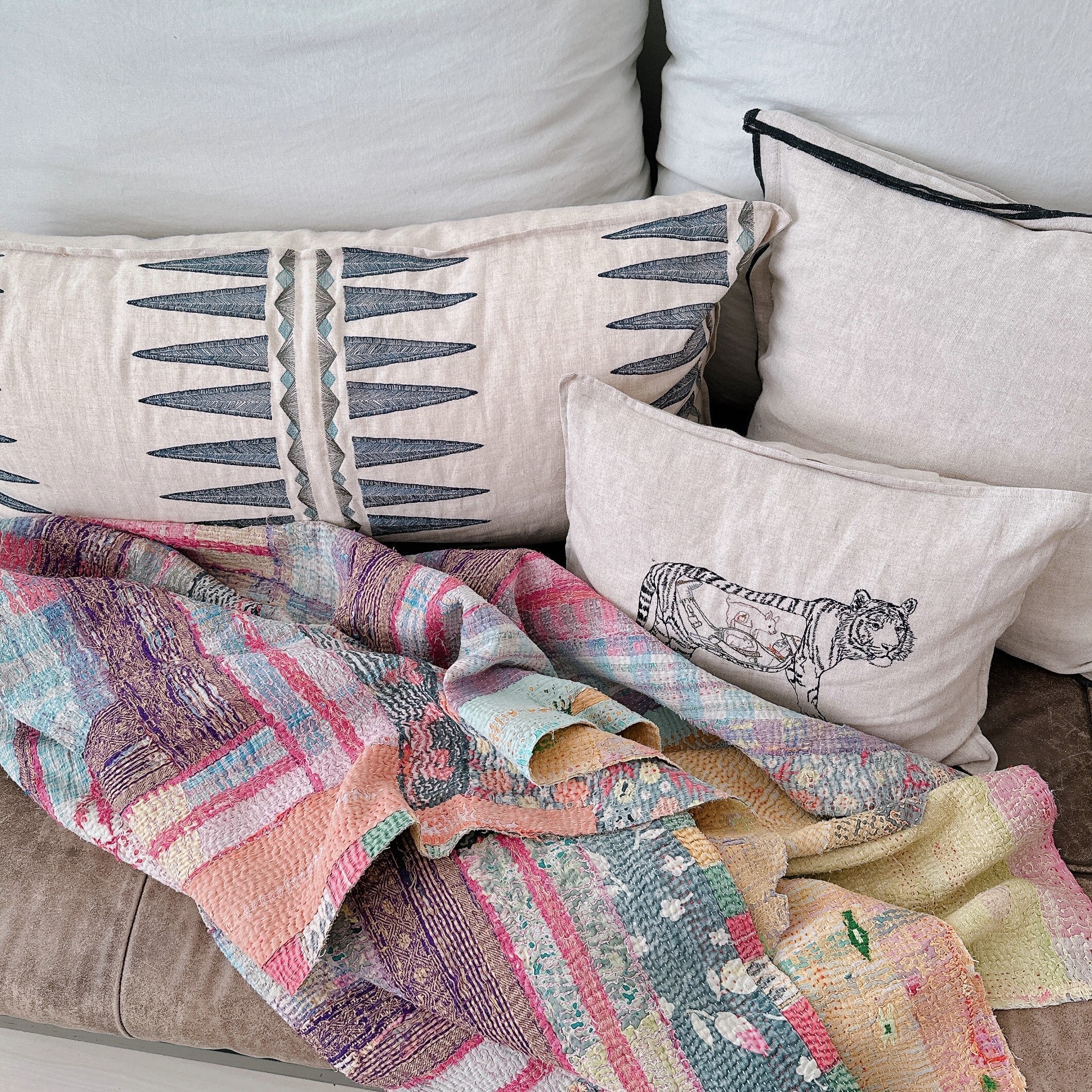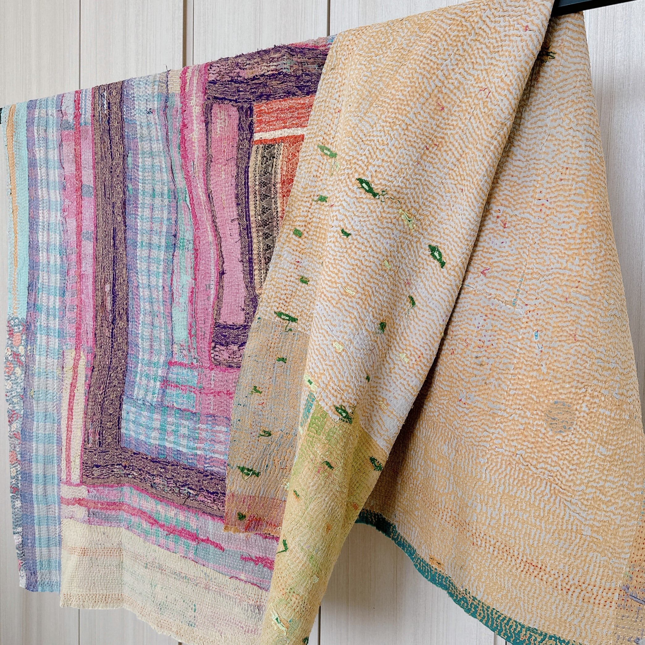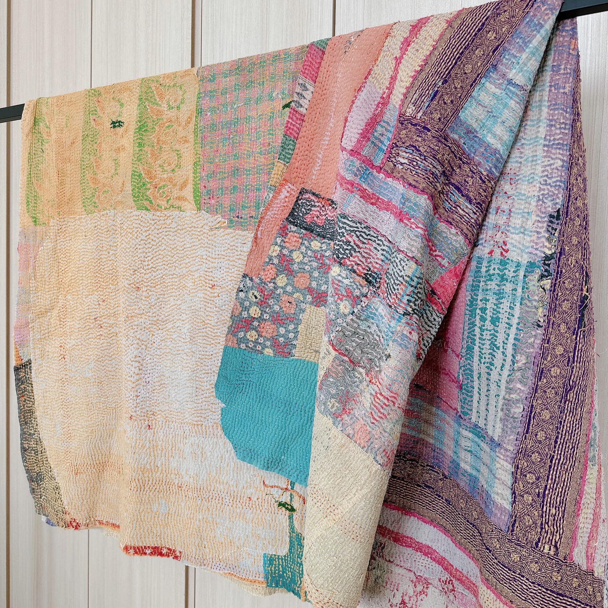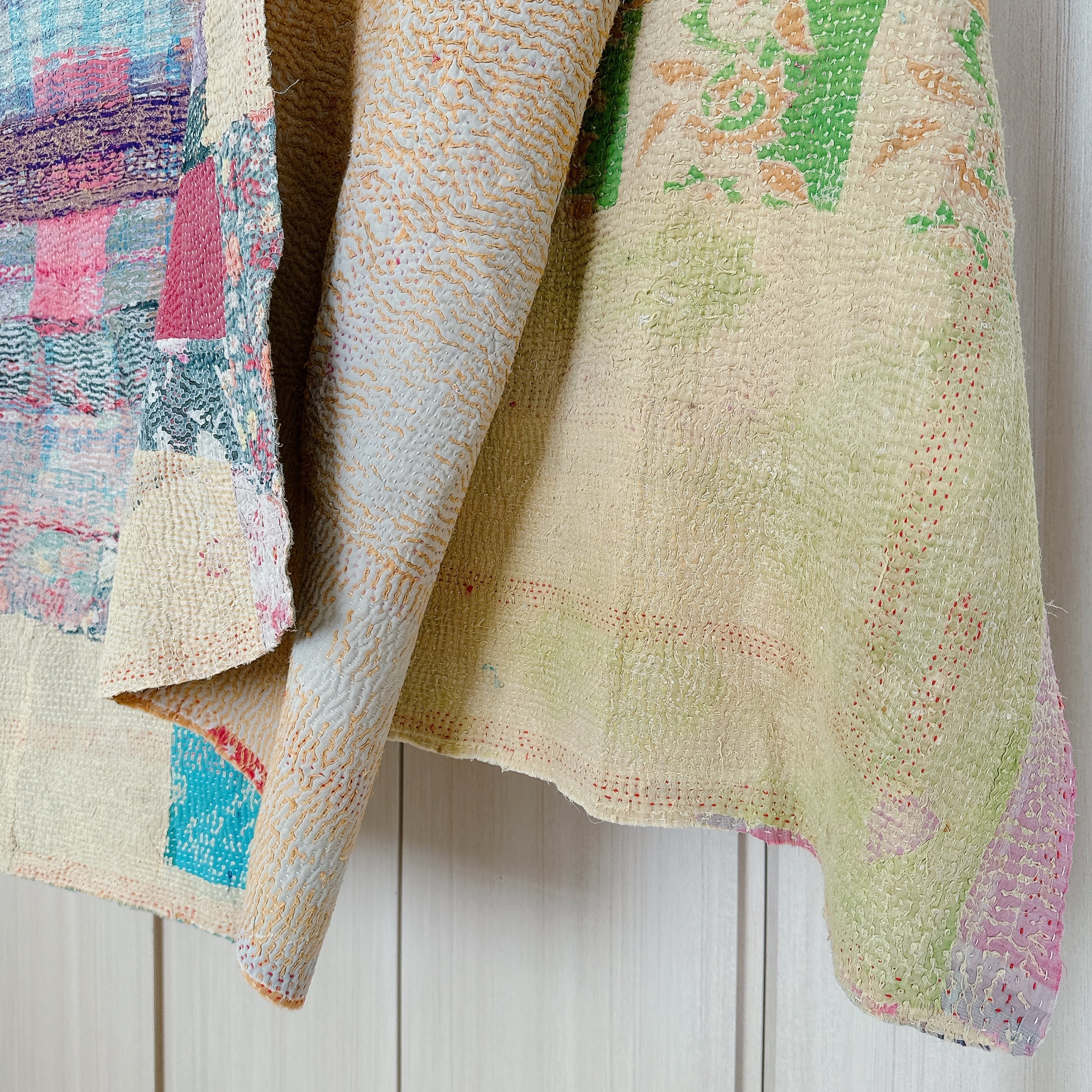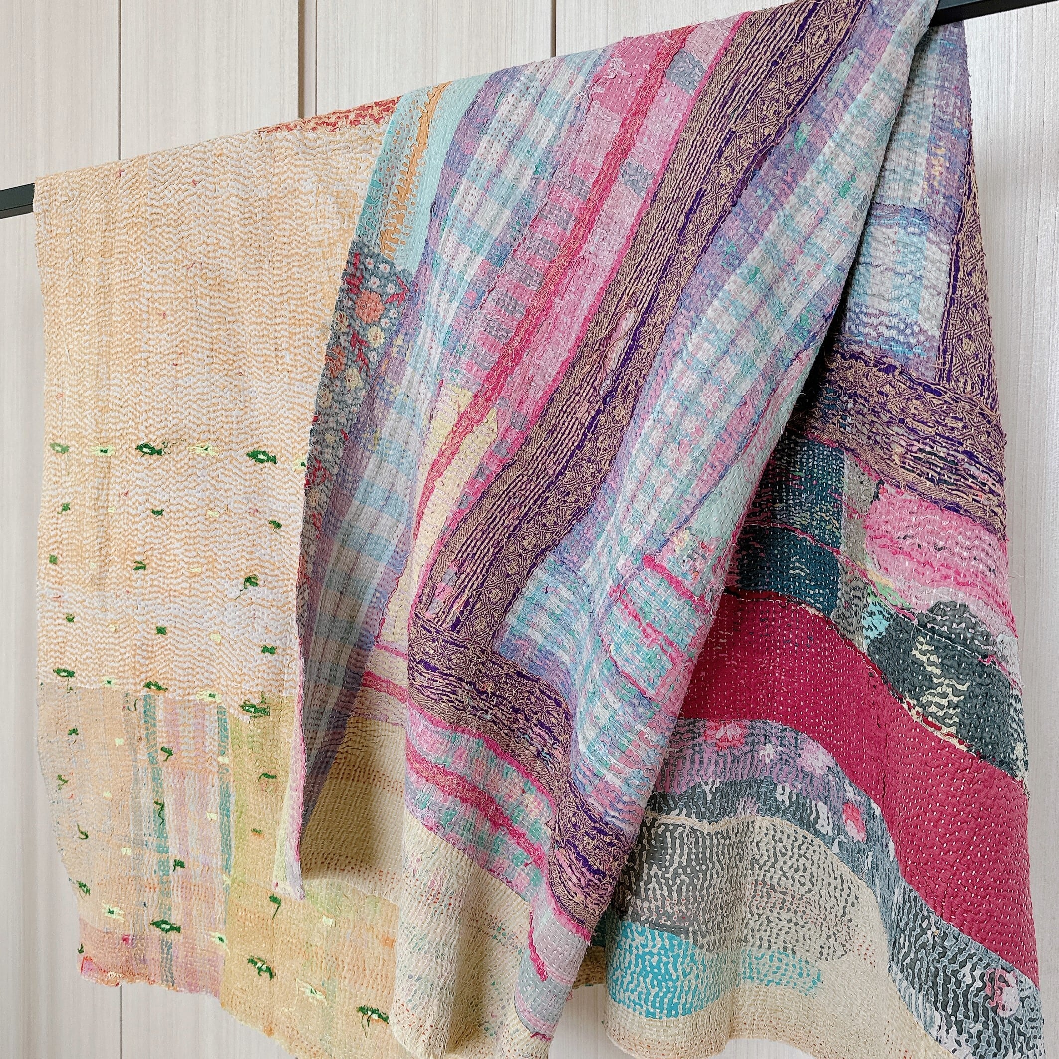 カンタキルトとは、年代物のサリー(インドの民族衣装)をはじめとする古布を何枚も重ね、一針一針の刺し子によって新たな布へと生まれ変わらせた、手仕事によるリメイクキルトです。