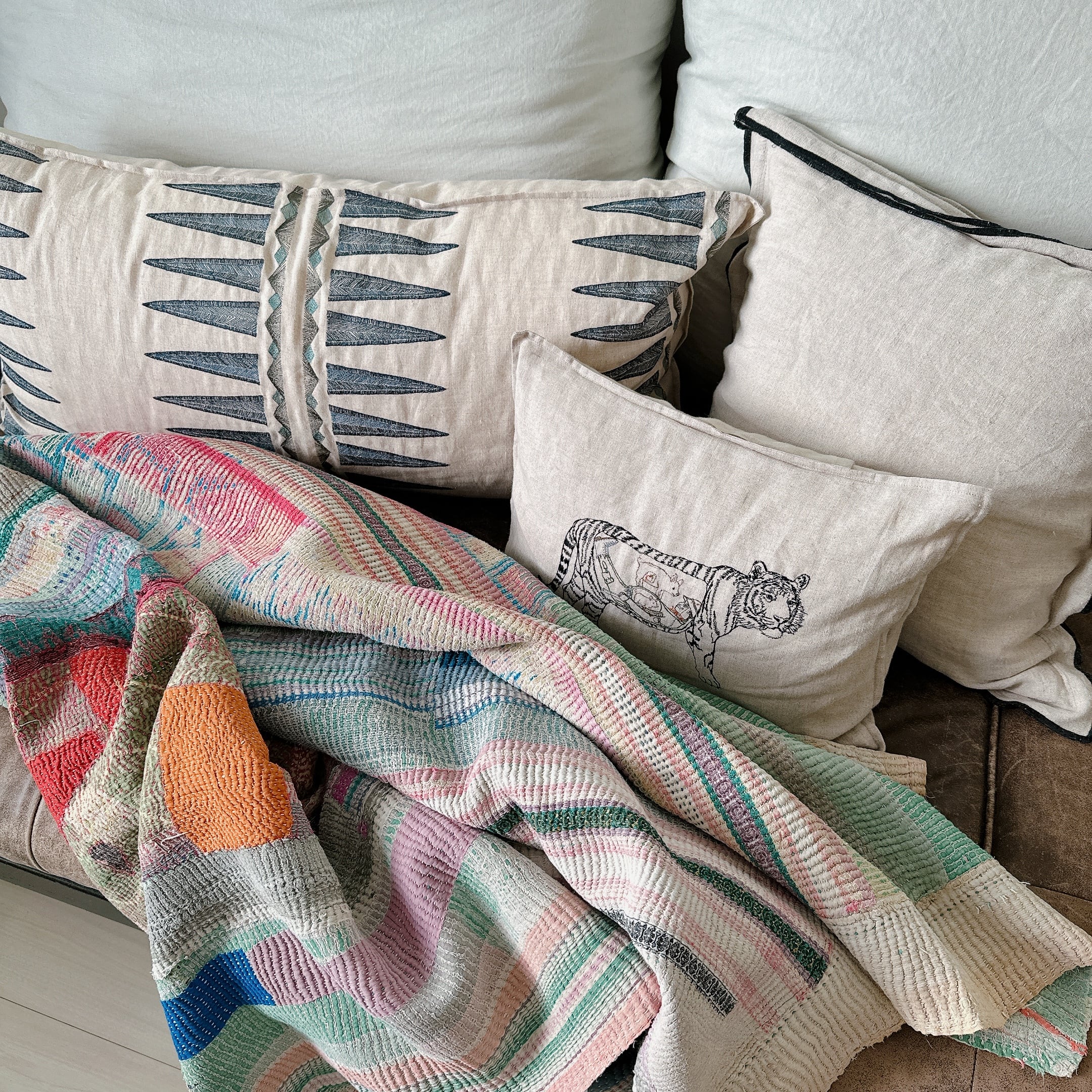 カンタキルトとは、年代物のサリー(インドの民族衣装)をはじめとする古布を何枚も重ね、一針一針の刺し子によって新たな布へと生まれ変わらせた、手仕事によるリメイクキルトです。