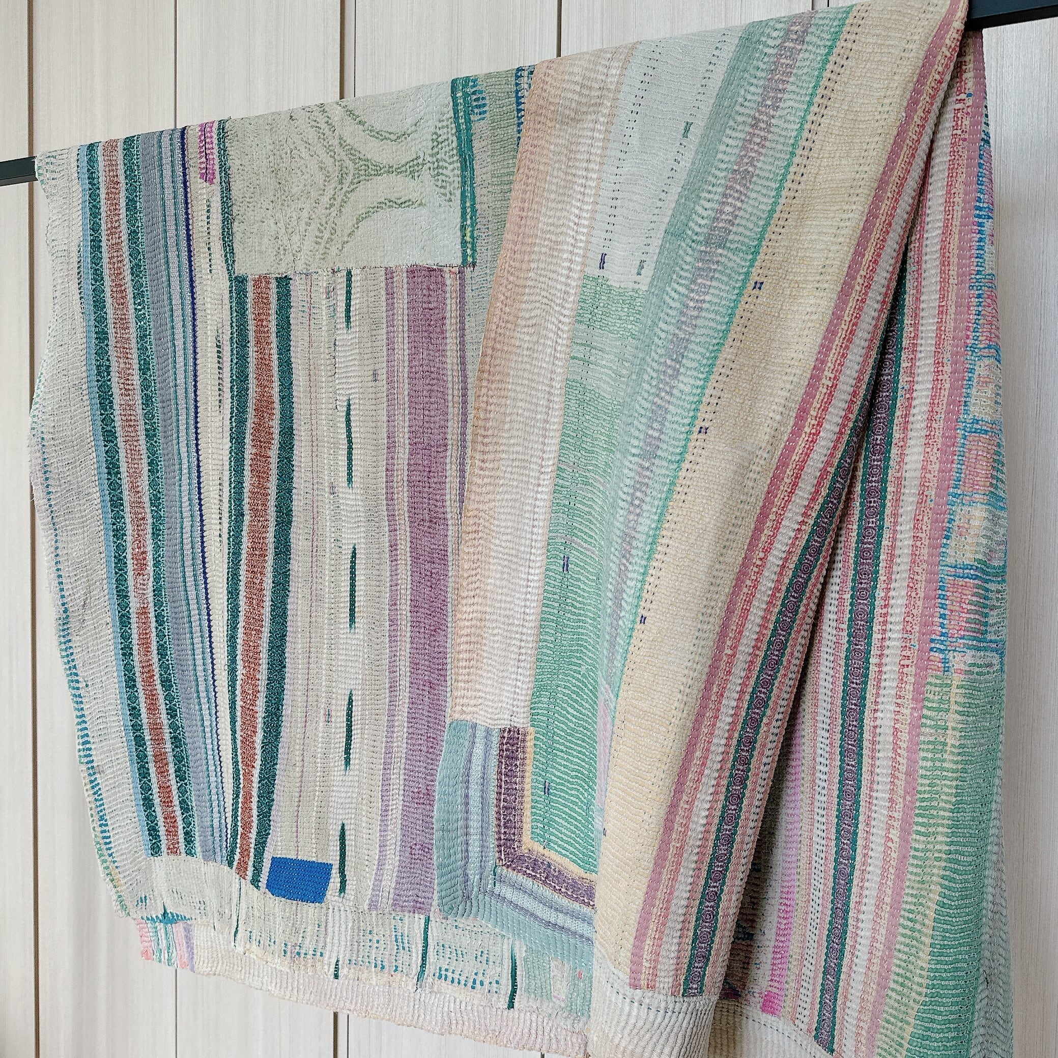 手仕事ゆえに、ところどころ糸のゆるみや小さな傷みが見られる場合がありますが、いずれも長い時間を重ねたカンタキルトならではの趣としてお楽しみいただけます。