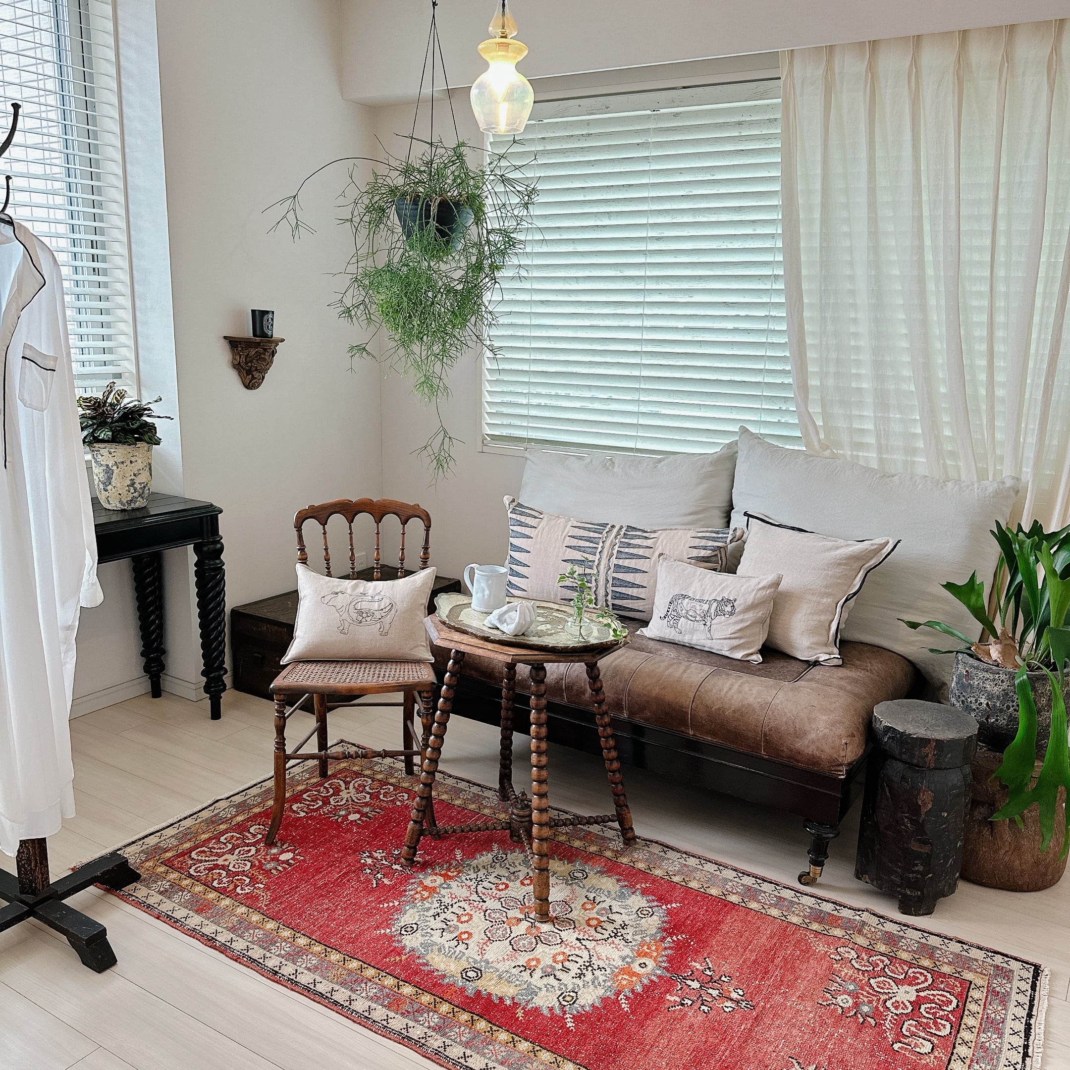 ヴィンテージ特有の擦れや色むらが美しく、手織りならではの温もりと奥行きを楽しめます。