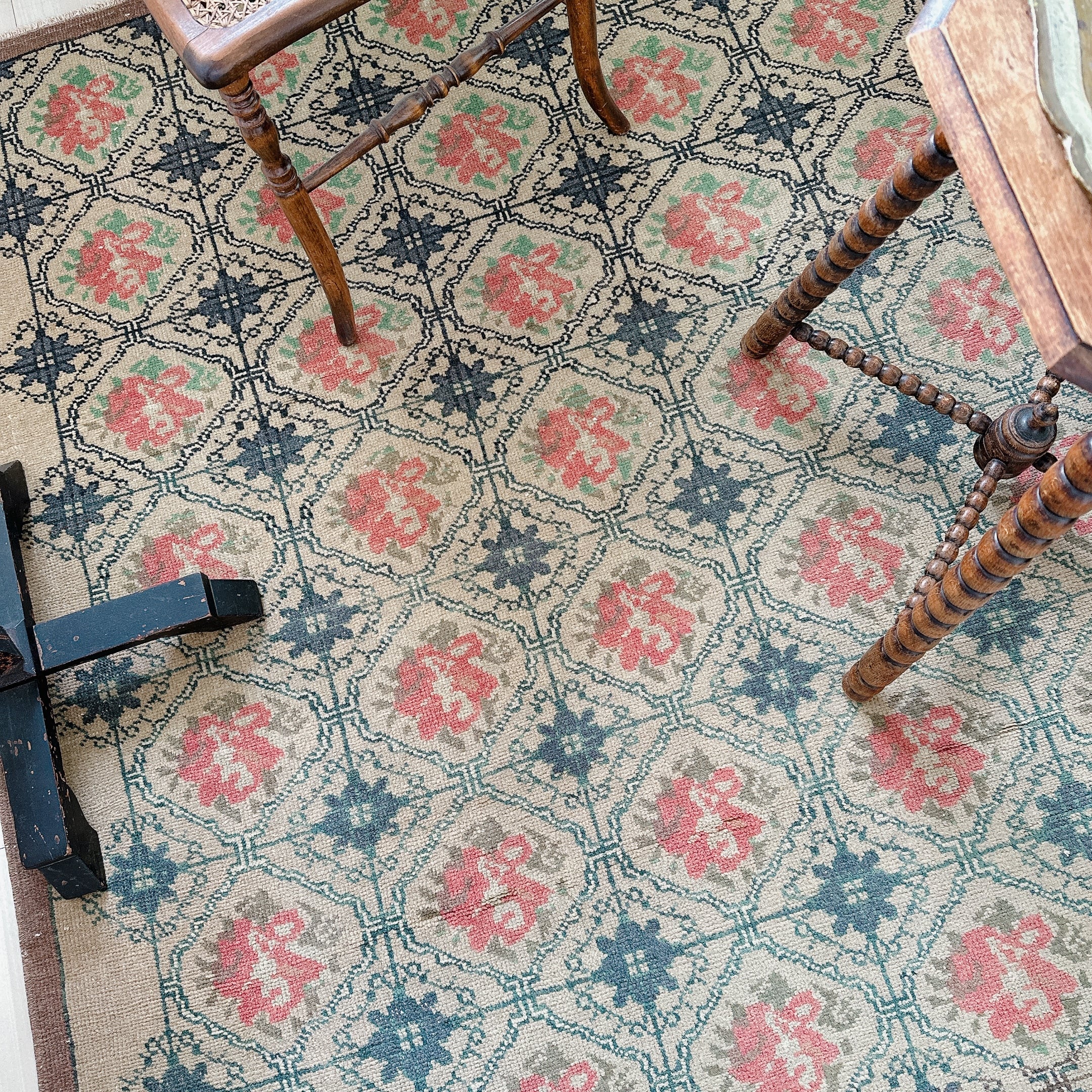 イスパルタラグの中でも、全体に規則的な連続パターンを保ちながら、グレージュ地にグリーンとレッドを配したこのようなデザインは珍しく、派手さを抑えた色使いの中に、どこか懐かしいレトロ感と上品さが共存しています。