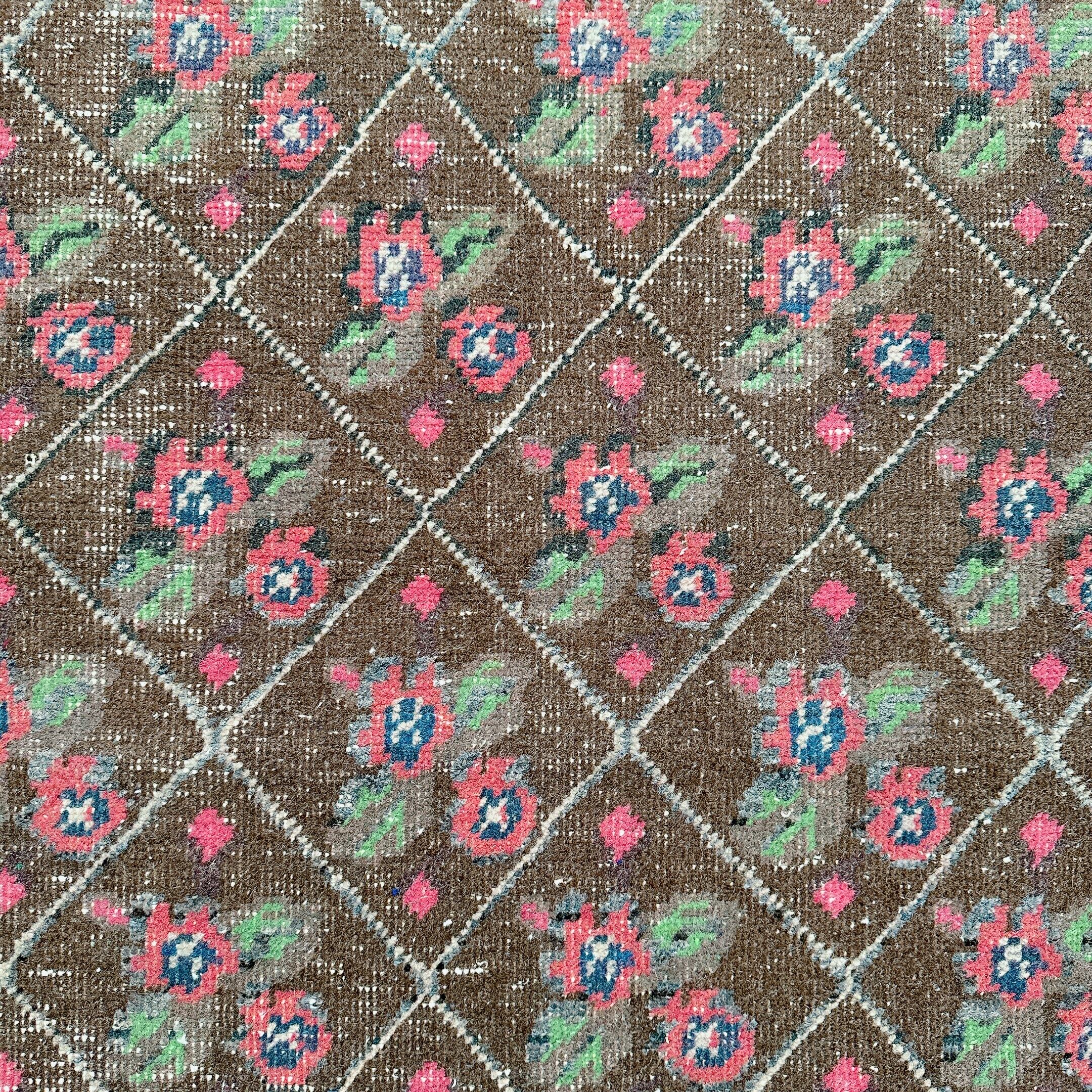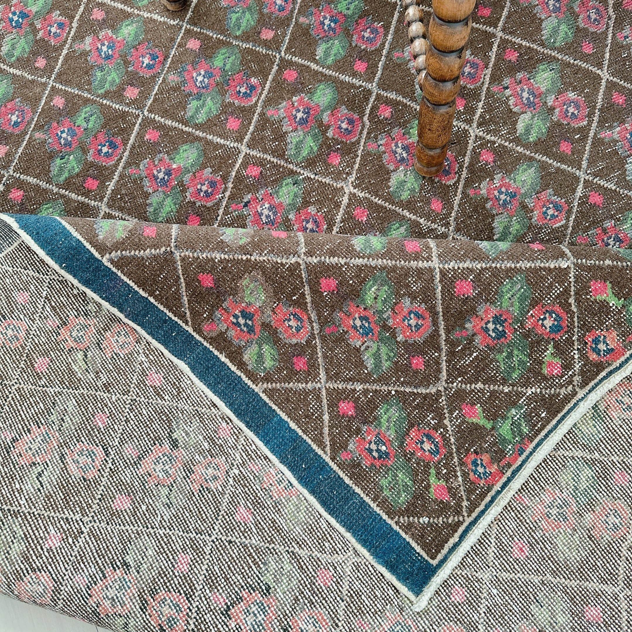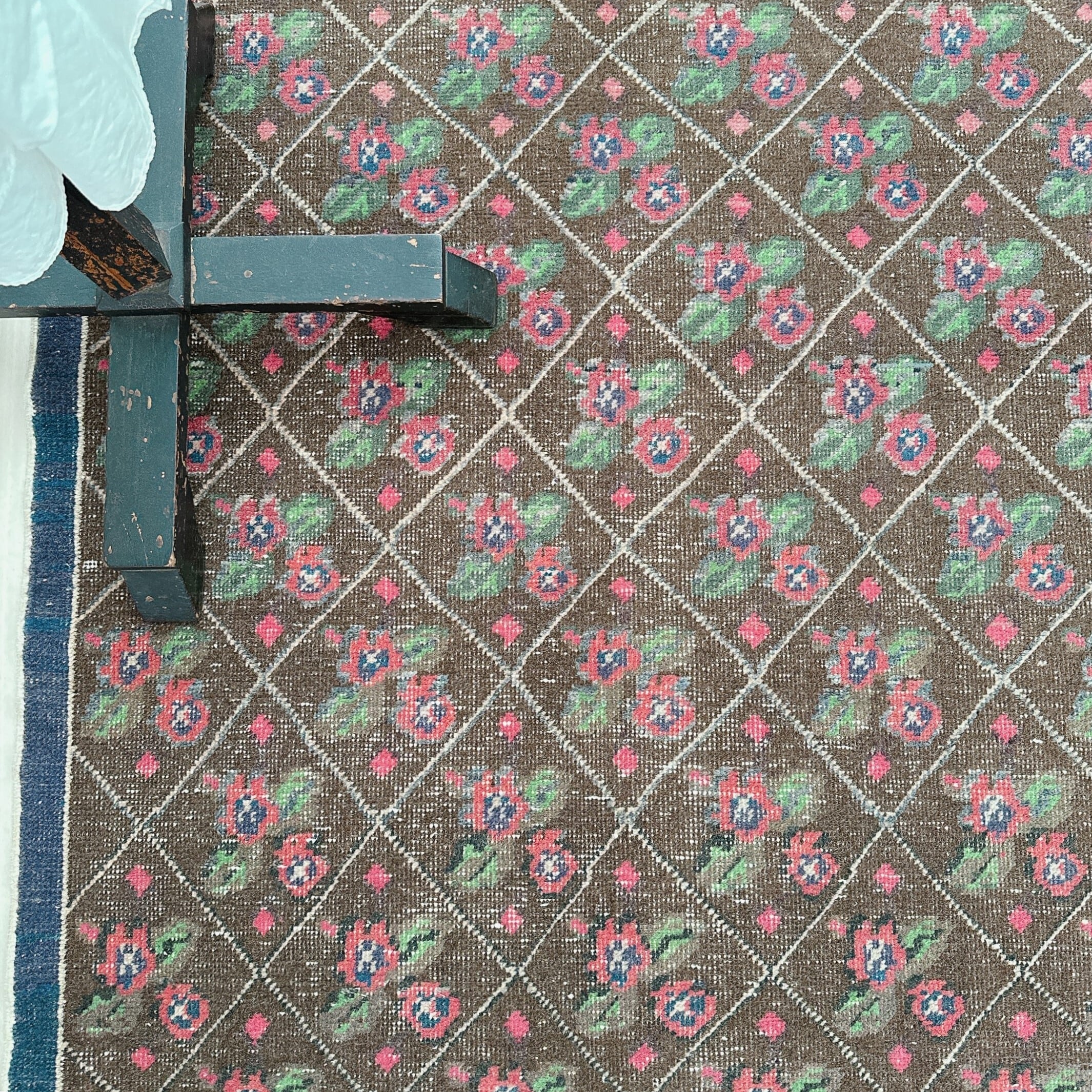 深みのあるブラウンを基調に、コーラルピンクの小花とグリーンのリーフモチーフが整然と並ぶ美しいイスパルタラグ。