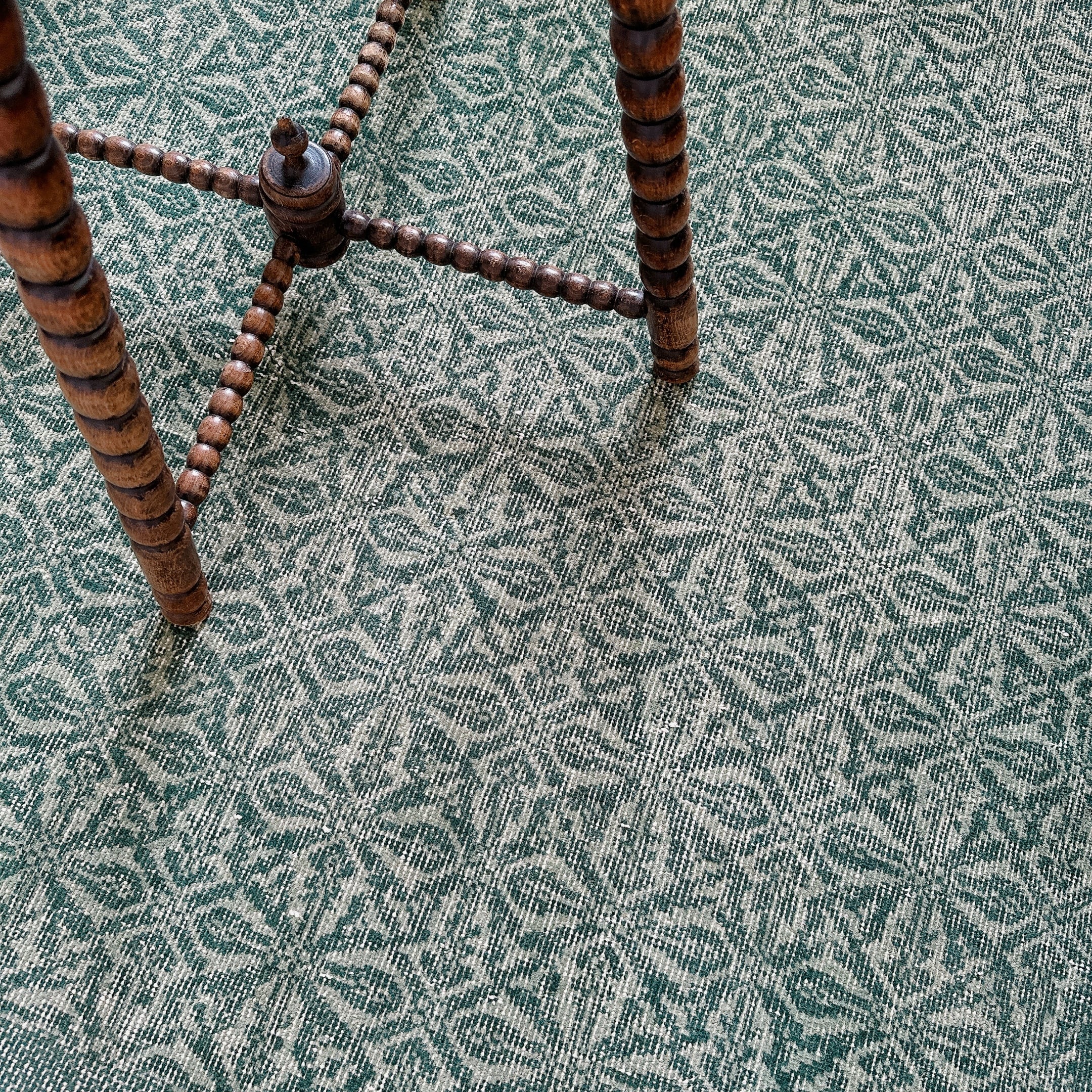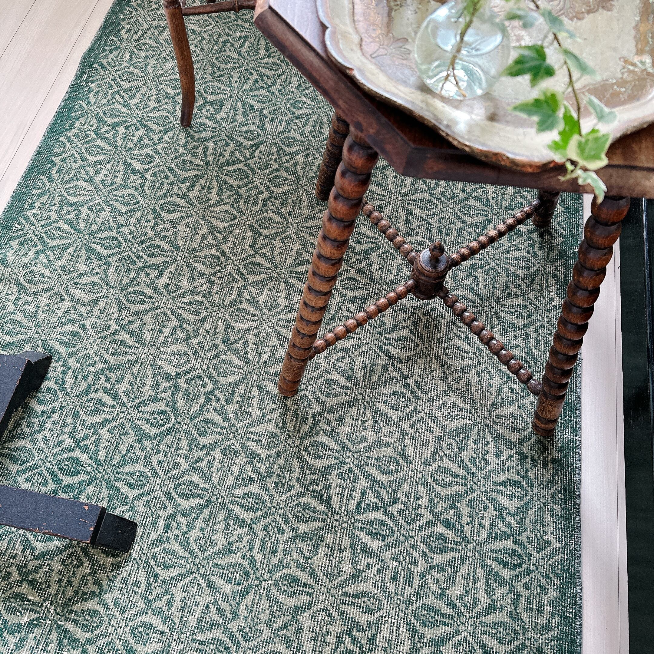 深みのあるグリーンを基調に、アイボリーで繊細に描かれたリーフモチーフが美しく連なるイスパルタラグ。