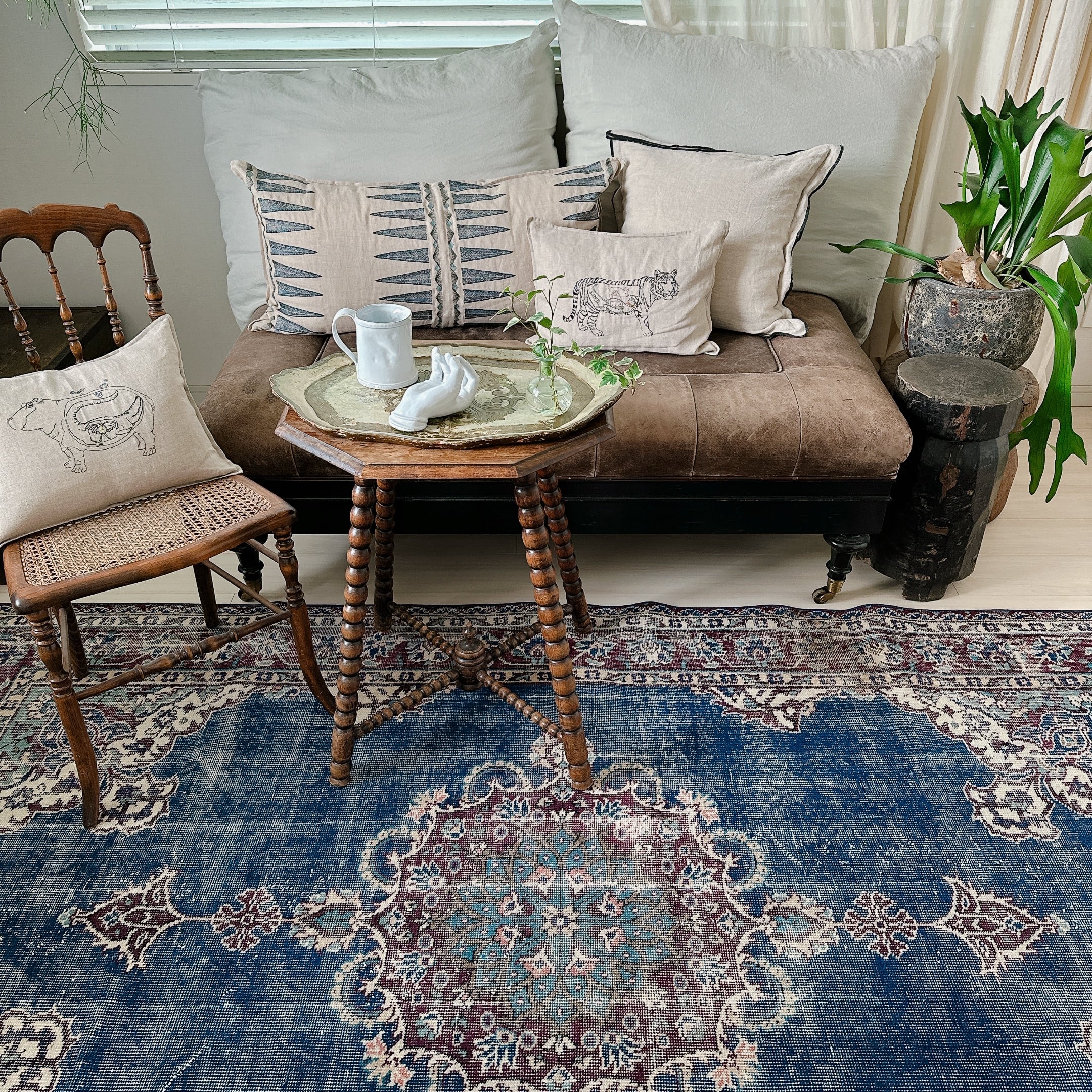 元々ネイビーで織られたラグは極めて珍しく、現地でも入手が難しい貴重な一枚です。