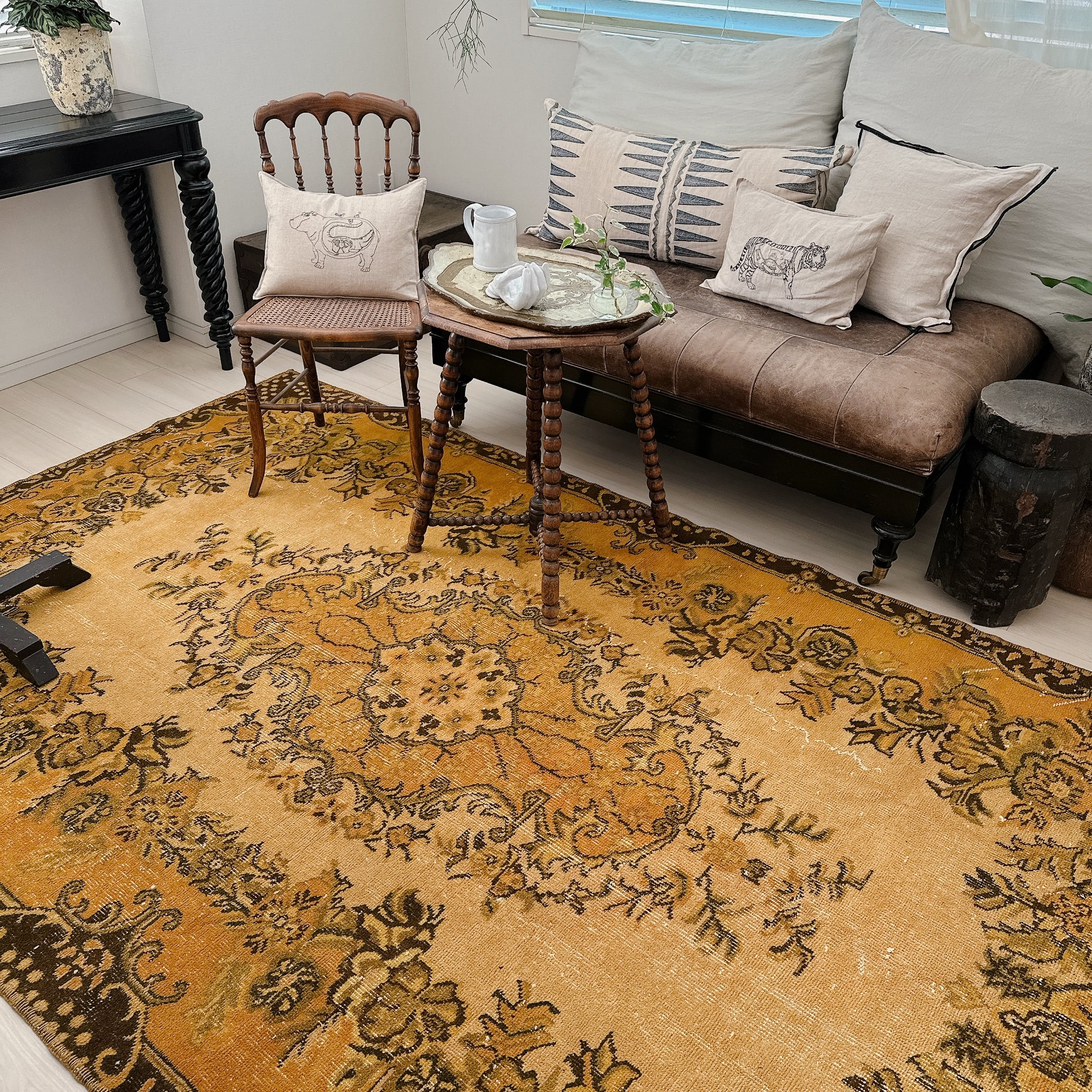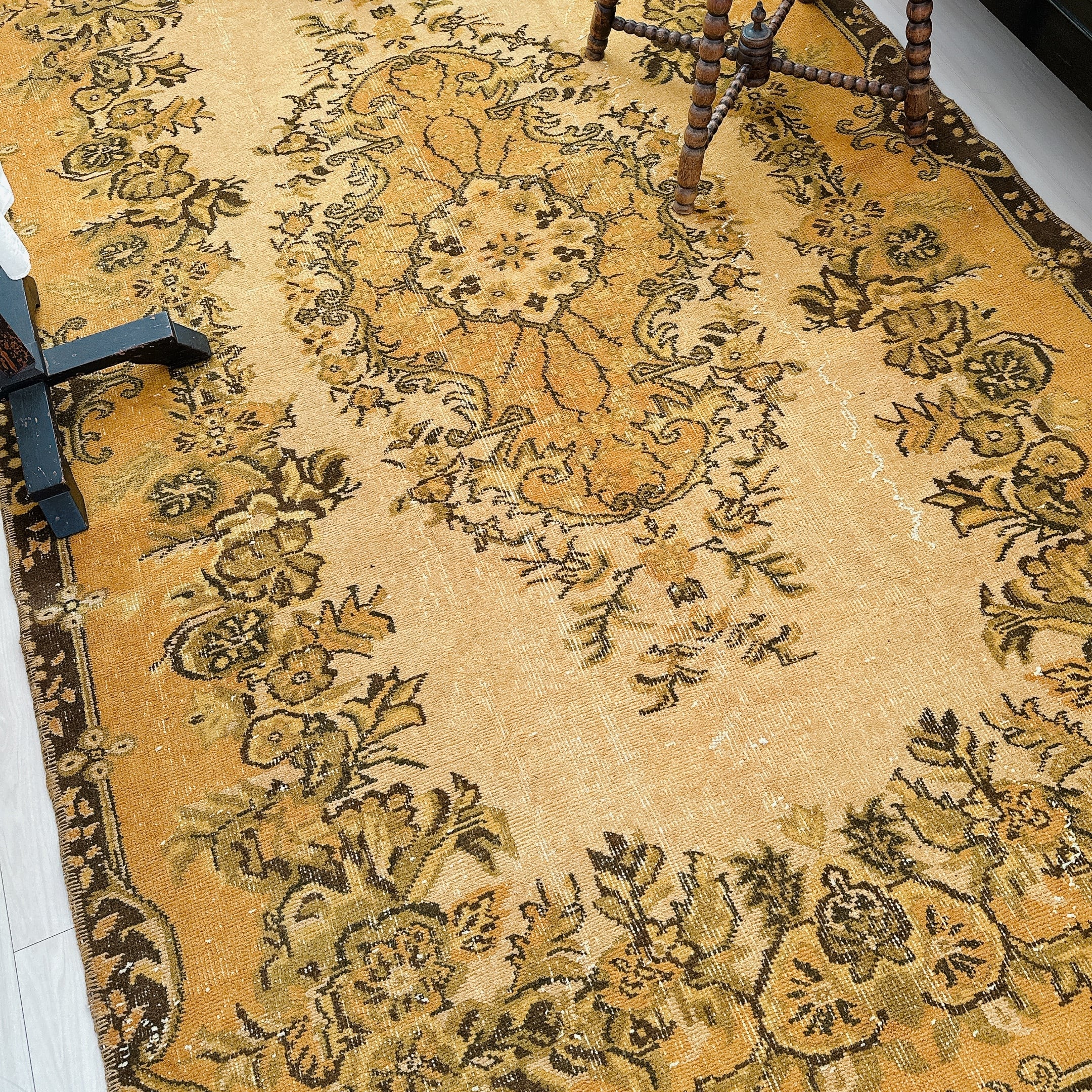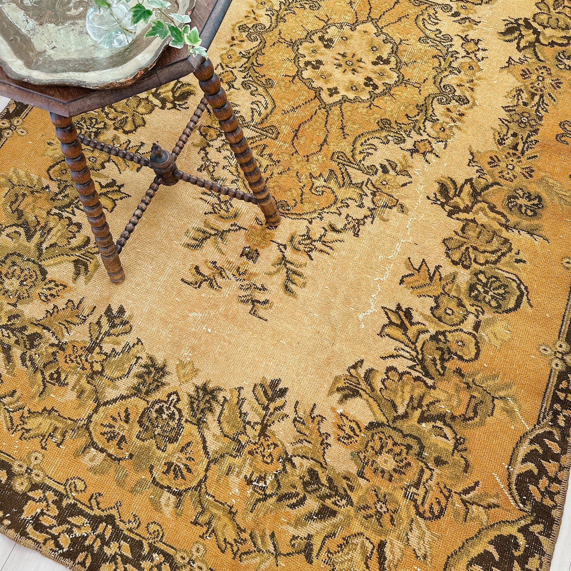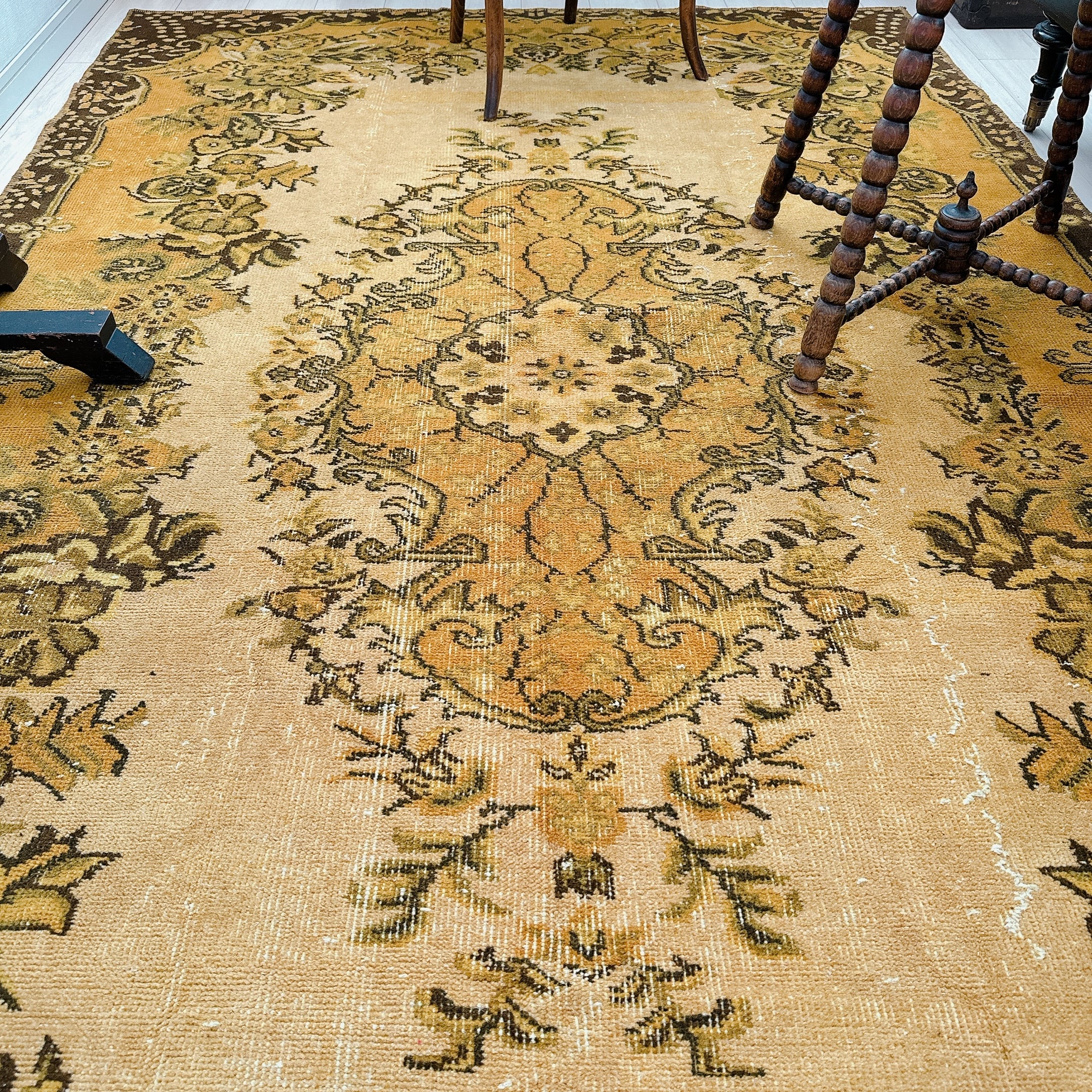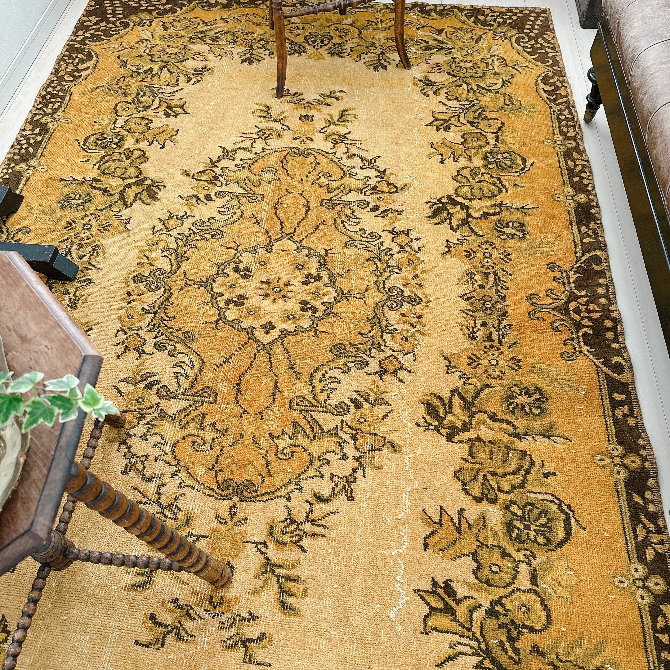 こちらのラグは特に、マスタードトーンの奥にほのかに残る模様の陰影が美しく、クラシックとモダンが共鳴する一枚です。