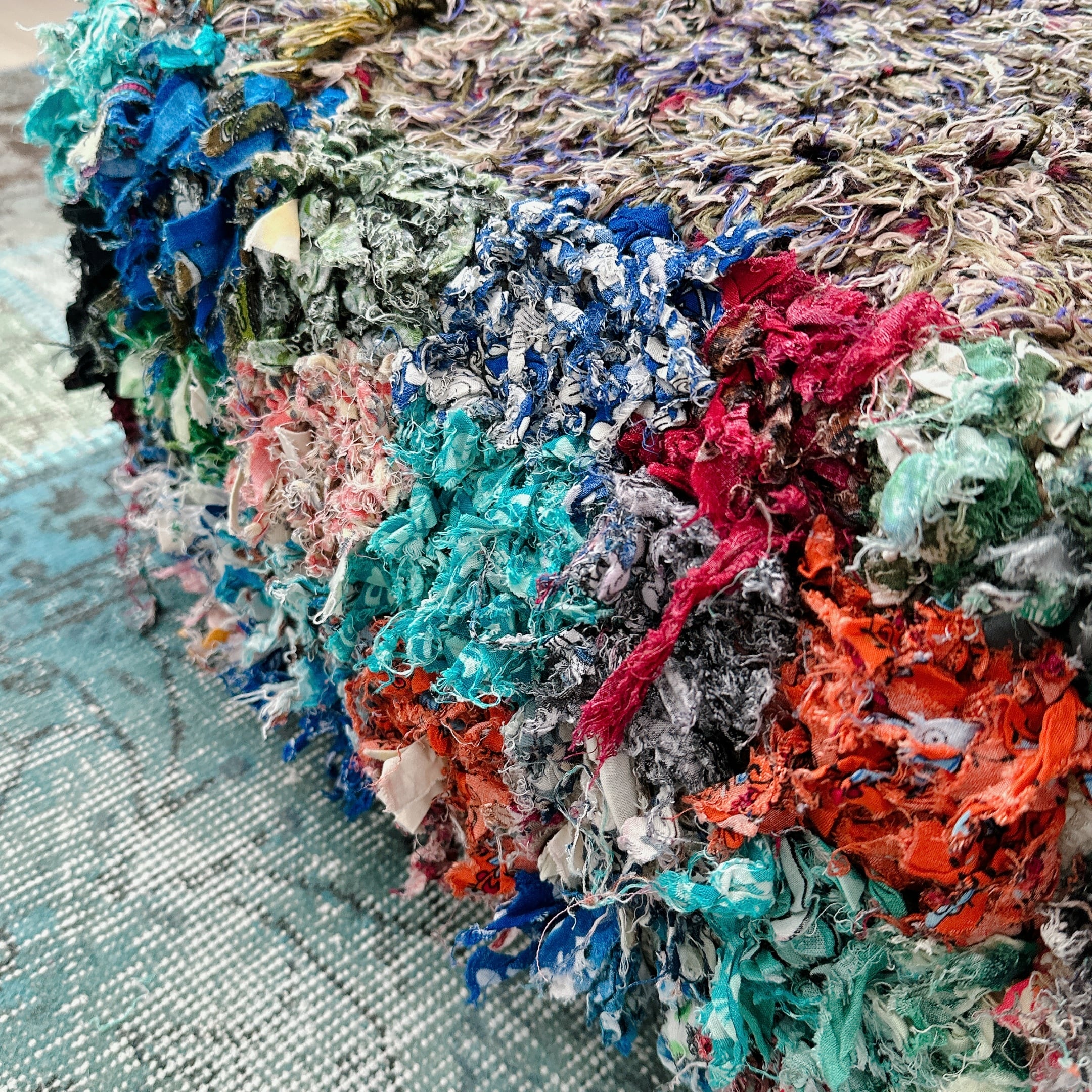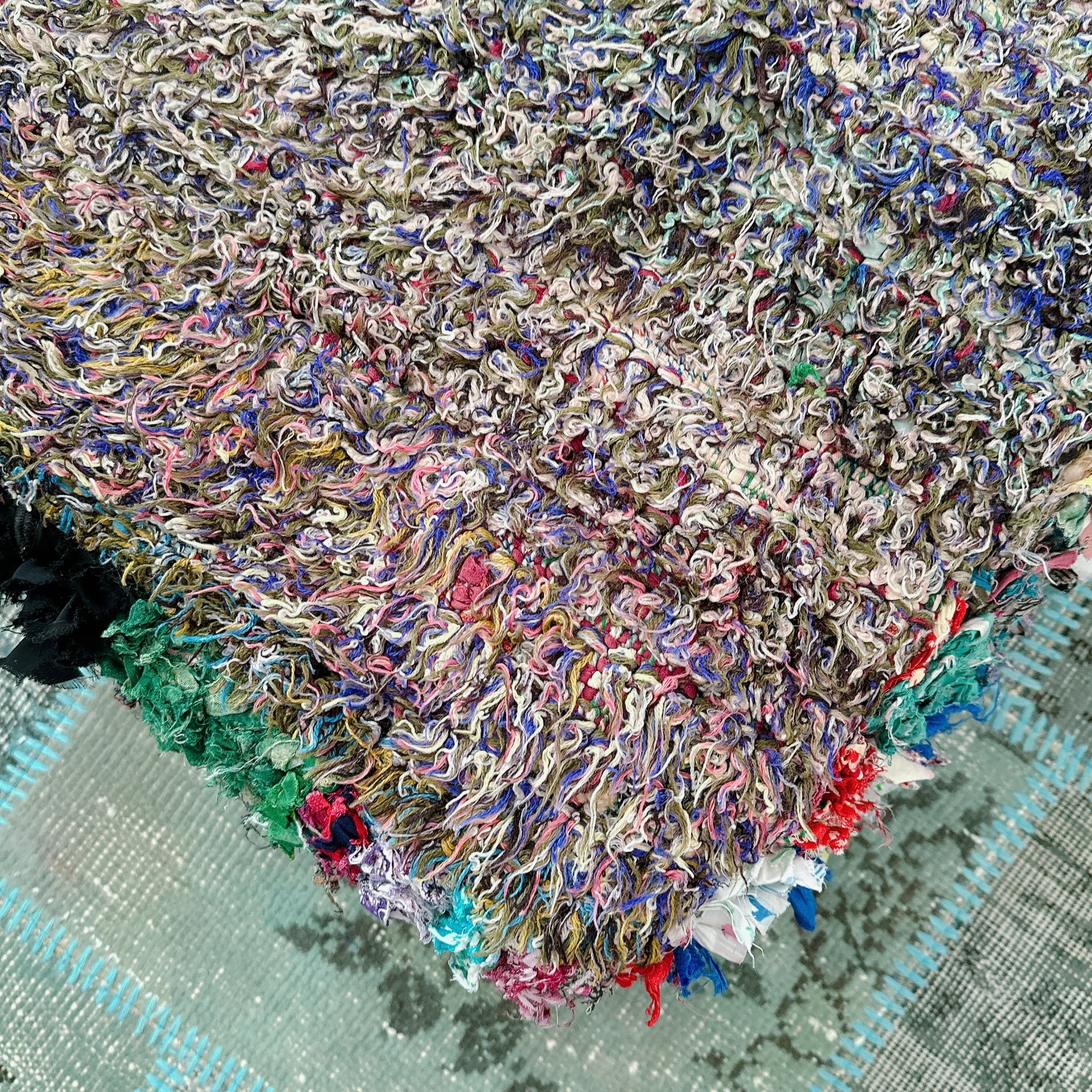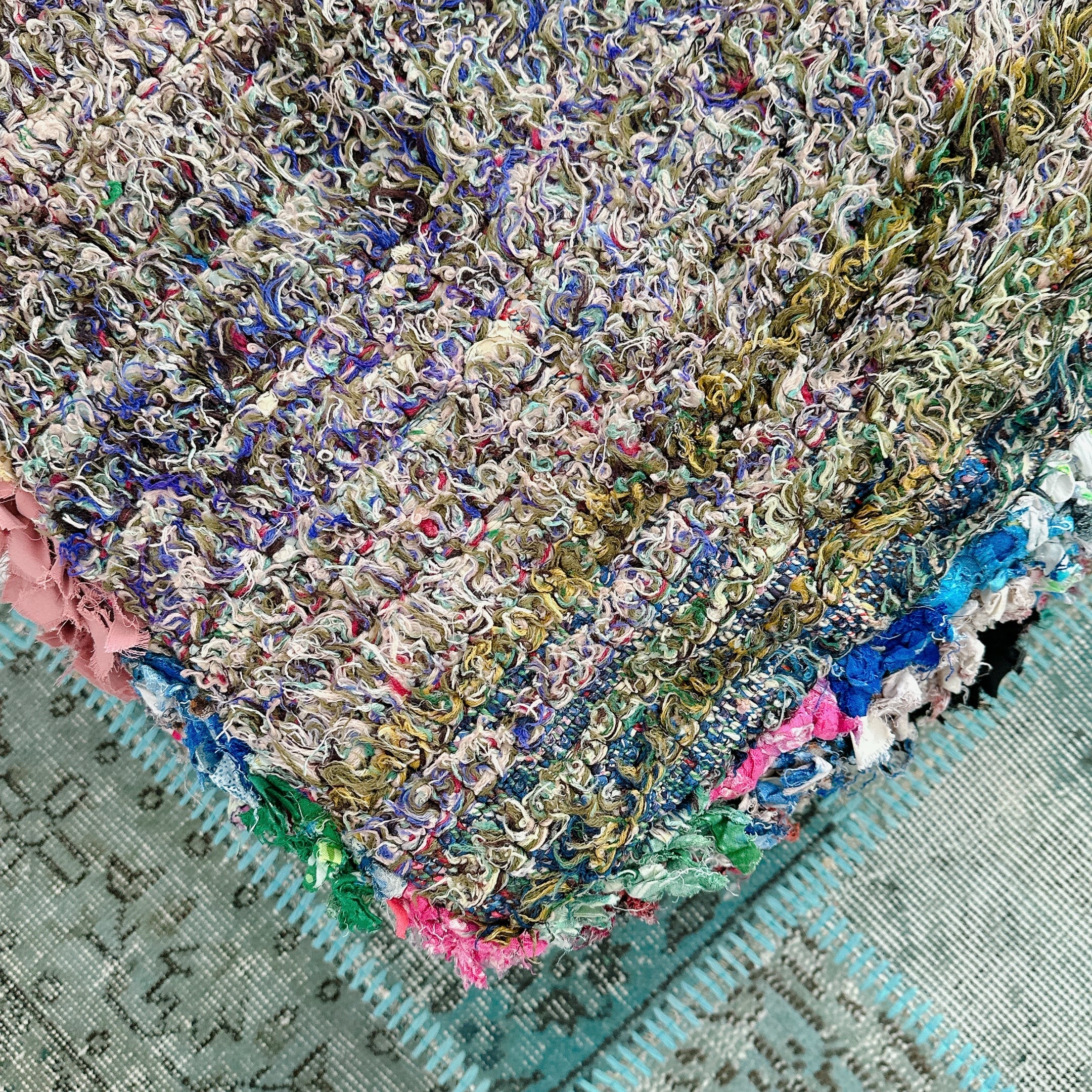 多彩な糸が絡み合う毛足は、角度や光の加減によってニュアンスが変化し、まるで抽象画のような立体感を生み出しています。