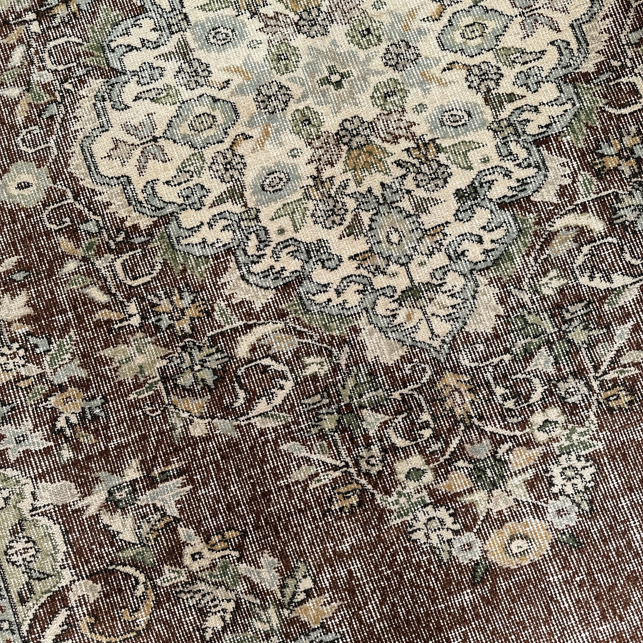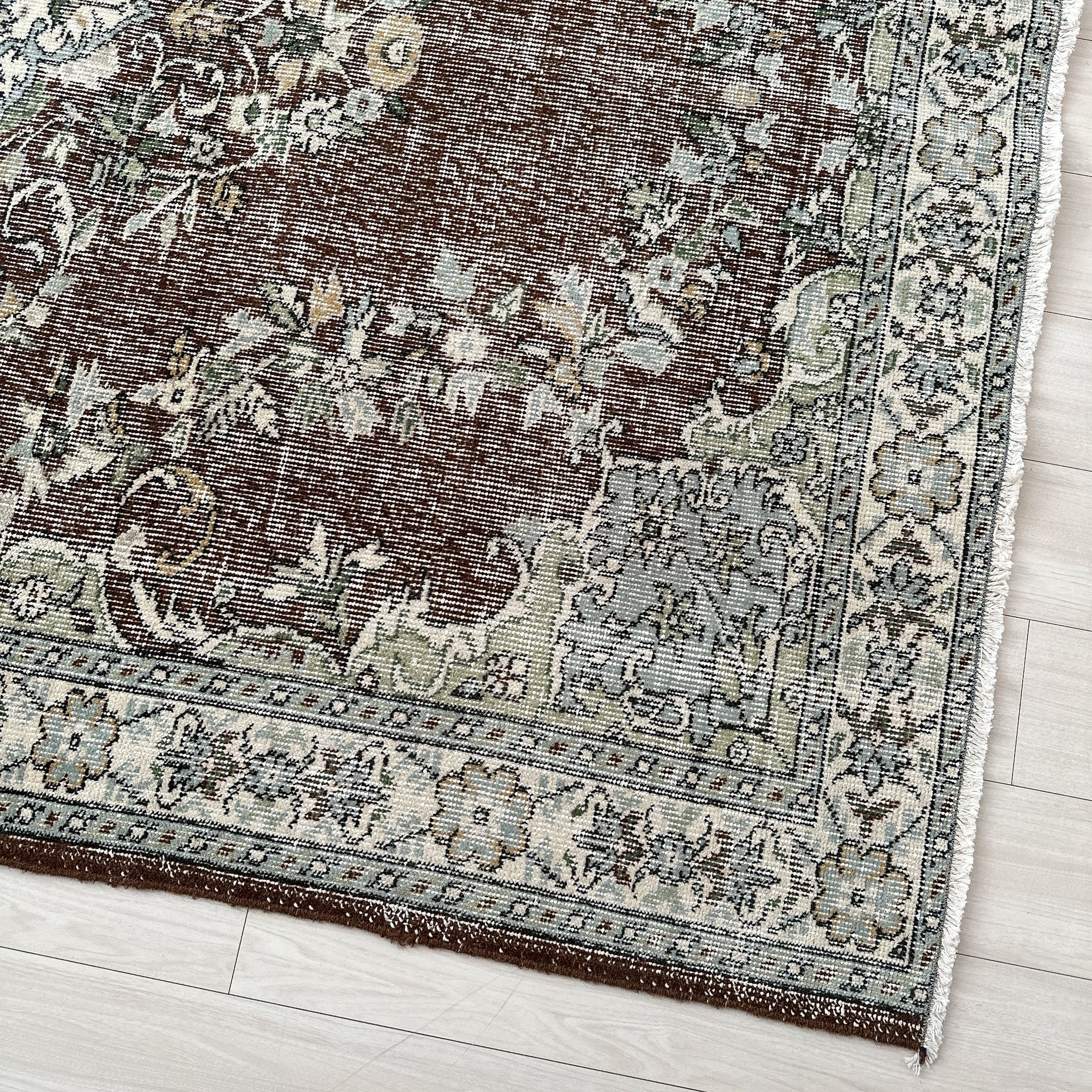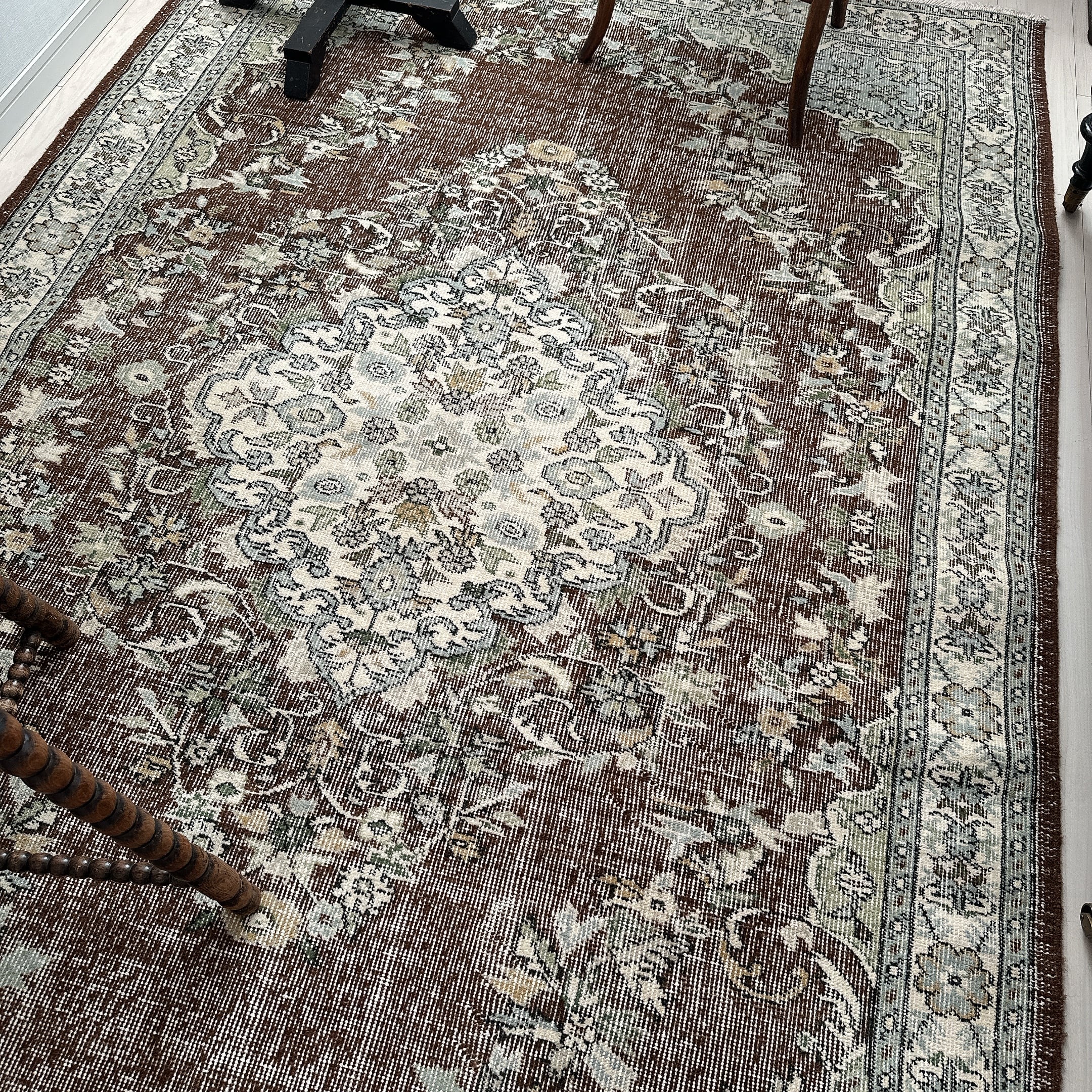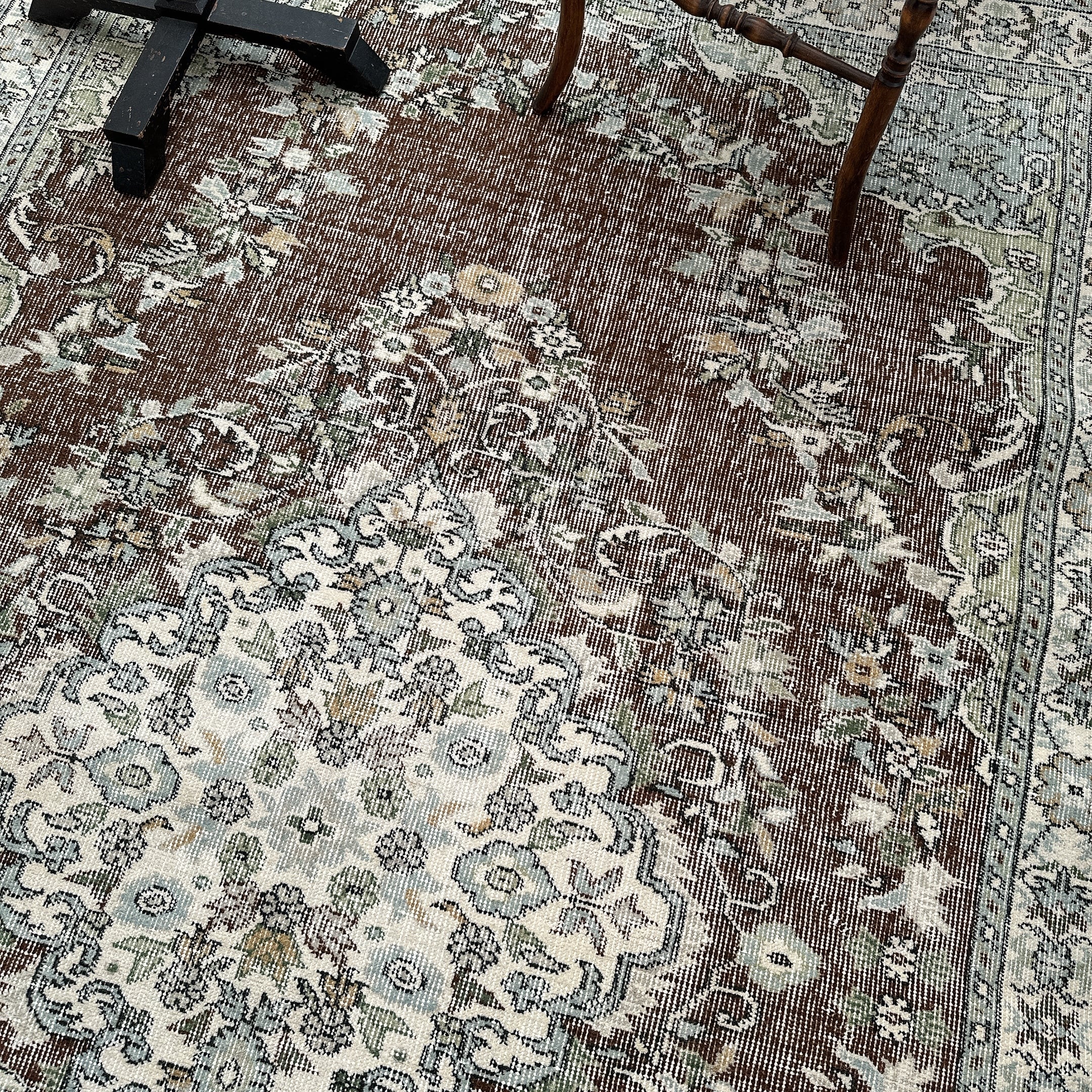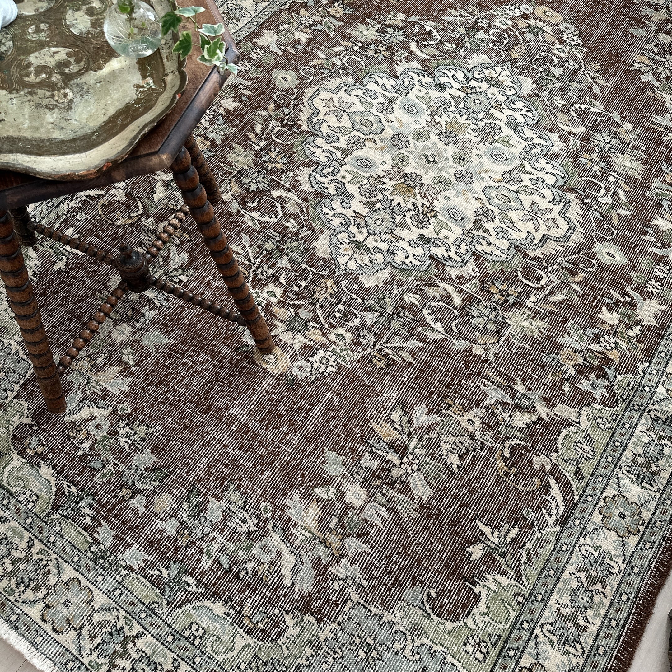 深みのあるダークブラウンを基調としながら、メダリオンやボーダーには柔らかなクリームが配され、アクセントとしてペールブルー、ペールグリーン、カーキベージュが加わることで、全体に軽やかな抜け感が生まれています。
