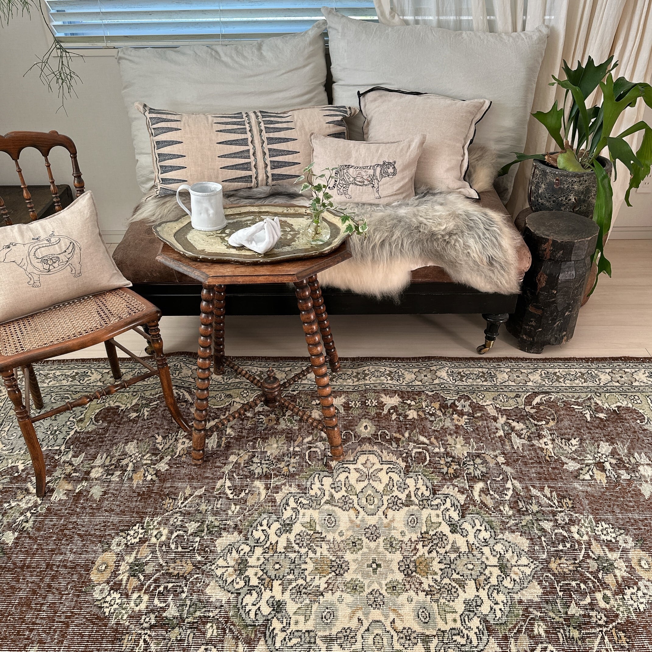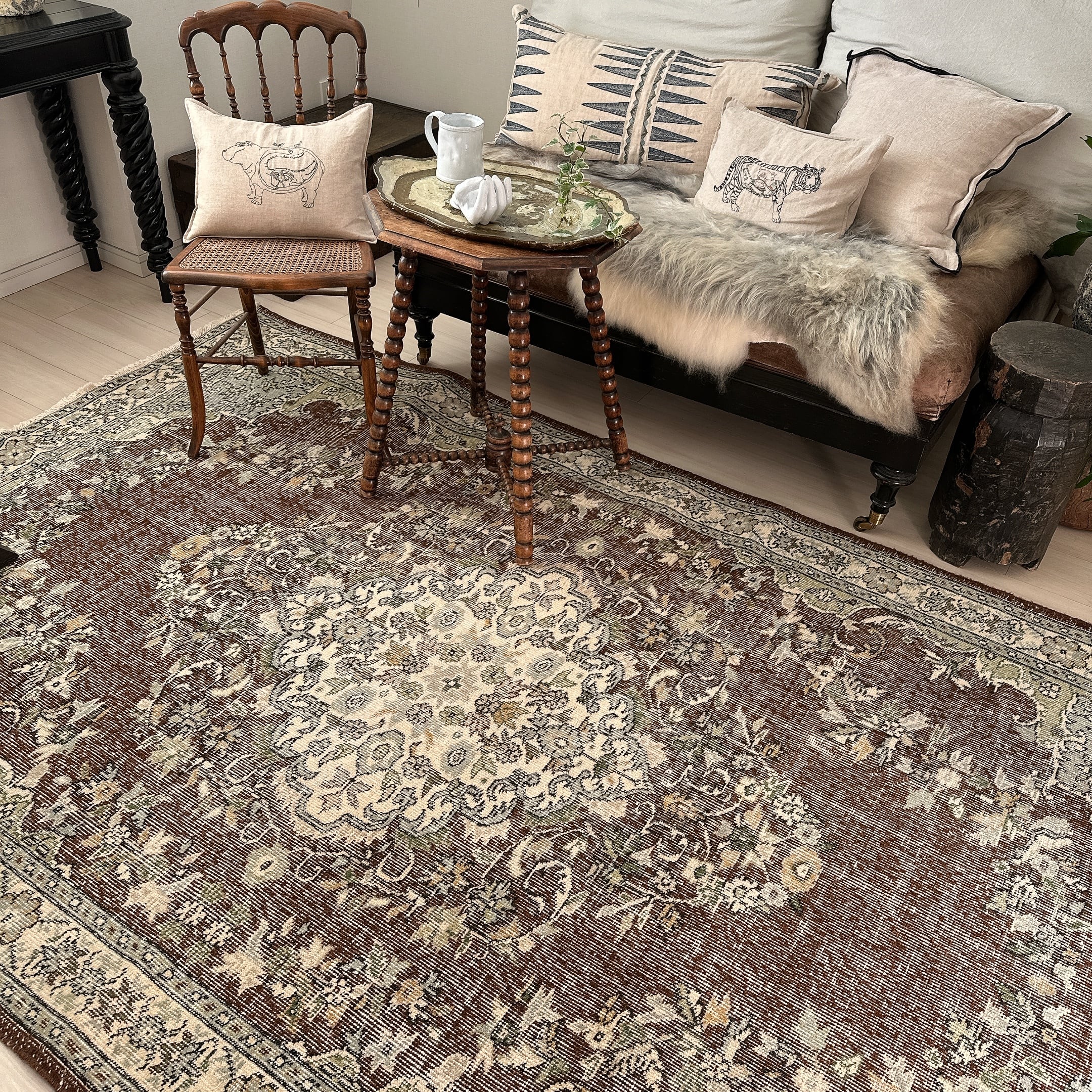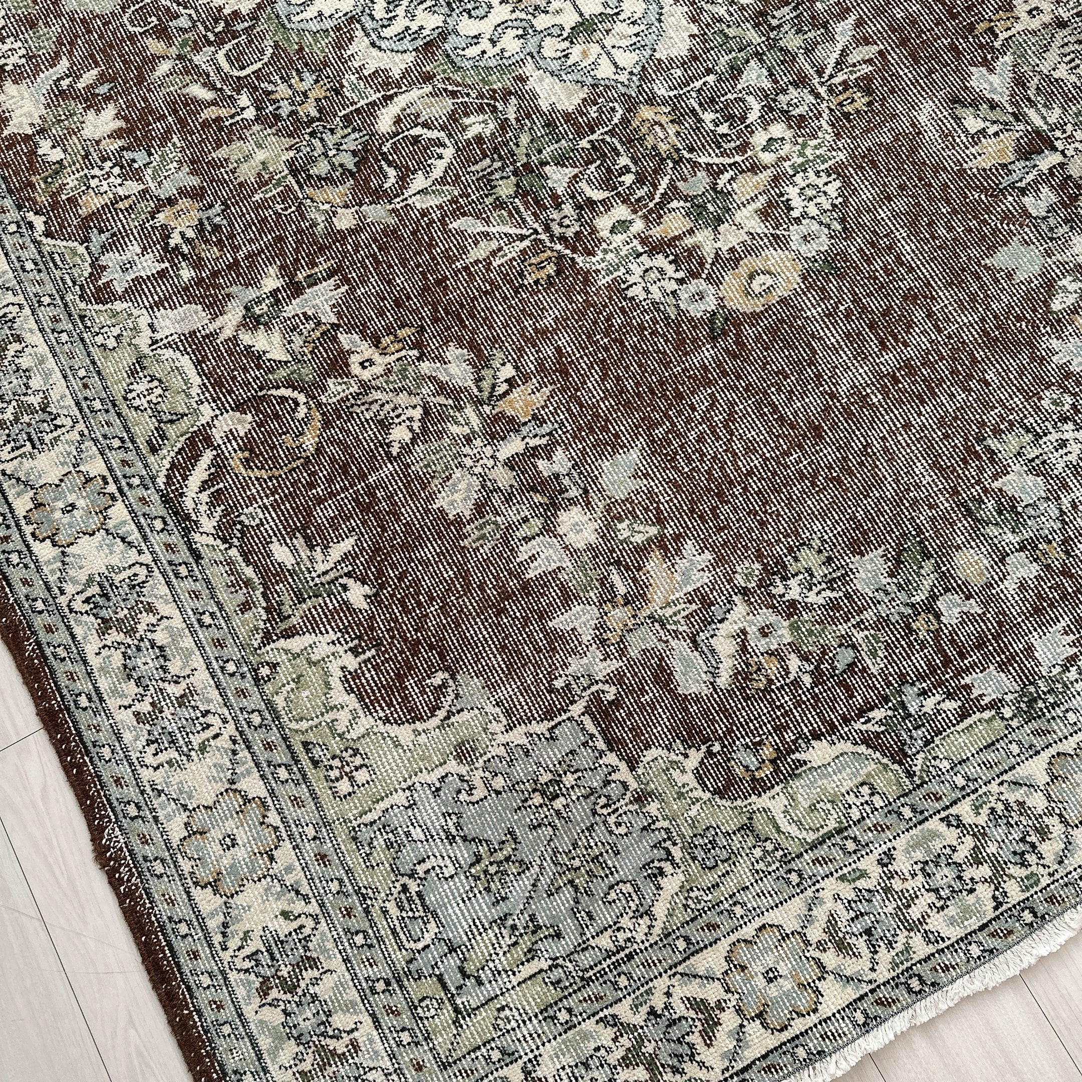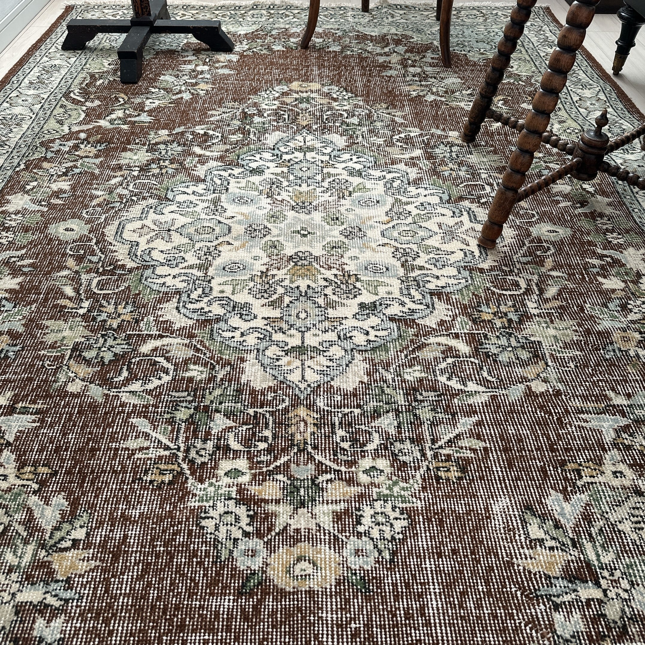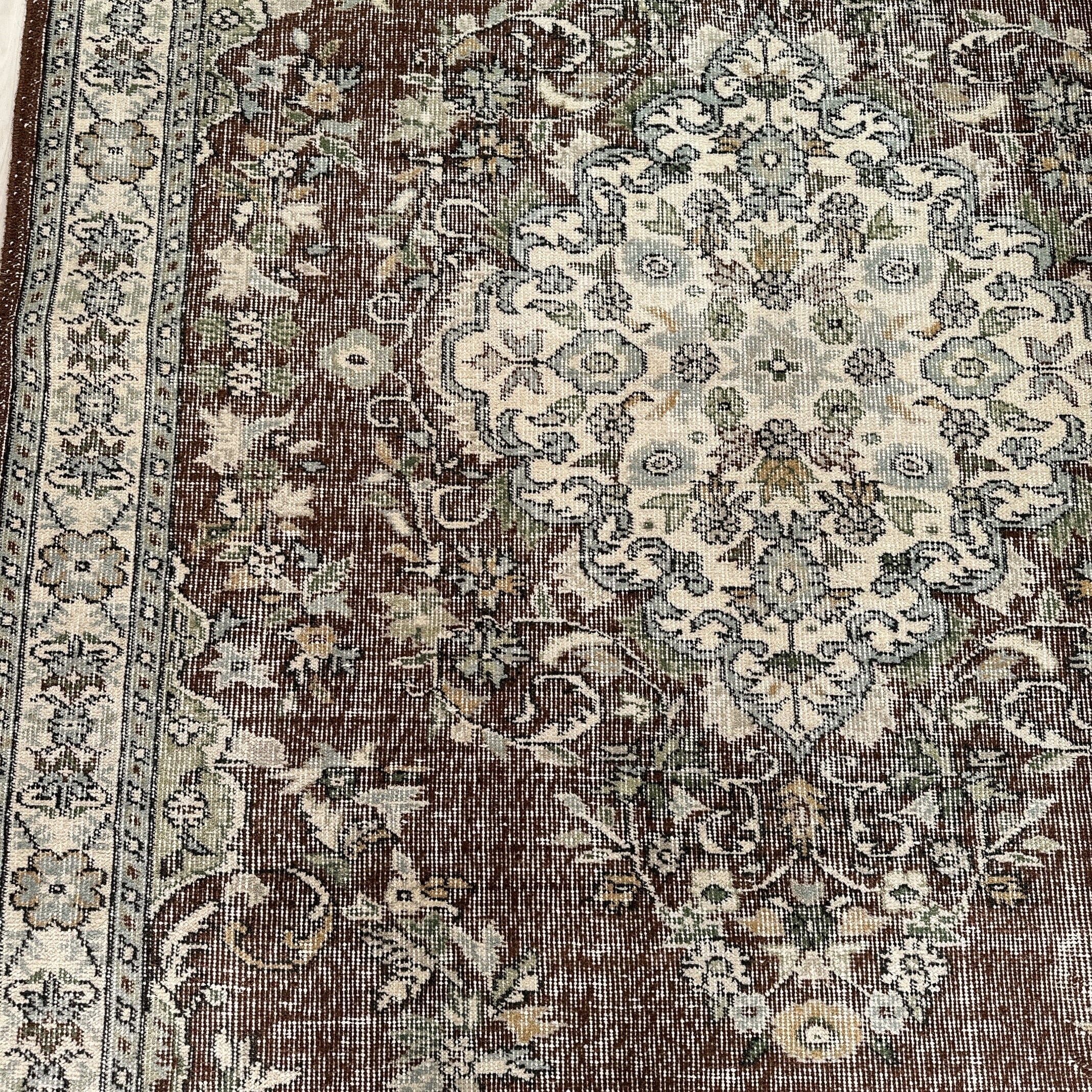深みのあるダークブラウンを基調としながら、メダリオンやボーダーには柔らかなクリームが配され、アクセントとしてペールブルー、ペールグリーン、カーキベージュが加わることで、全体に軽やかな抜け感が生まれています。
