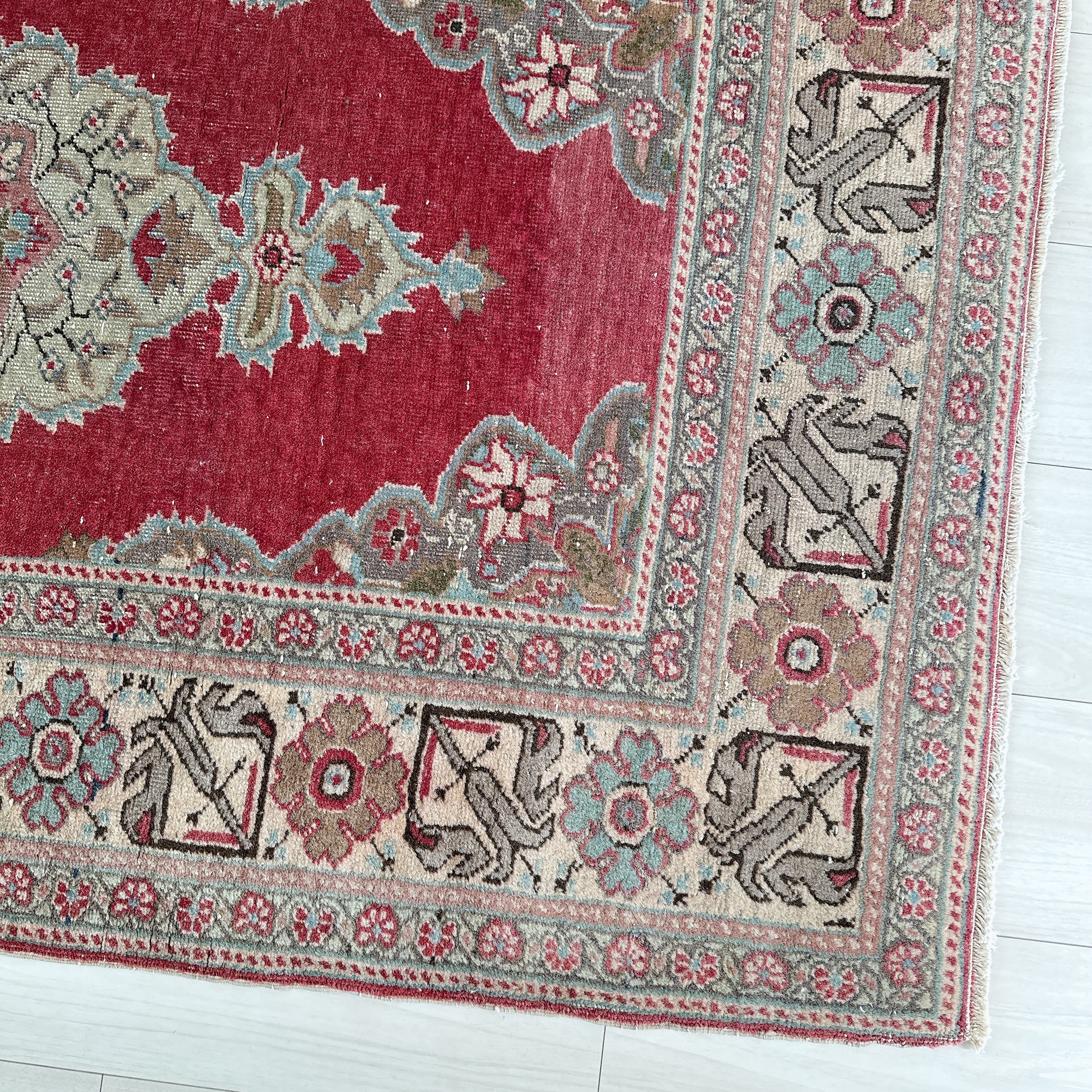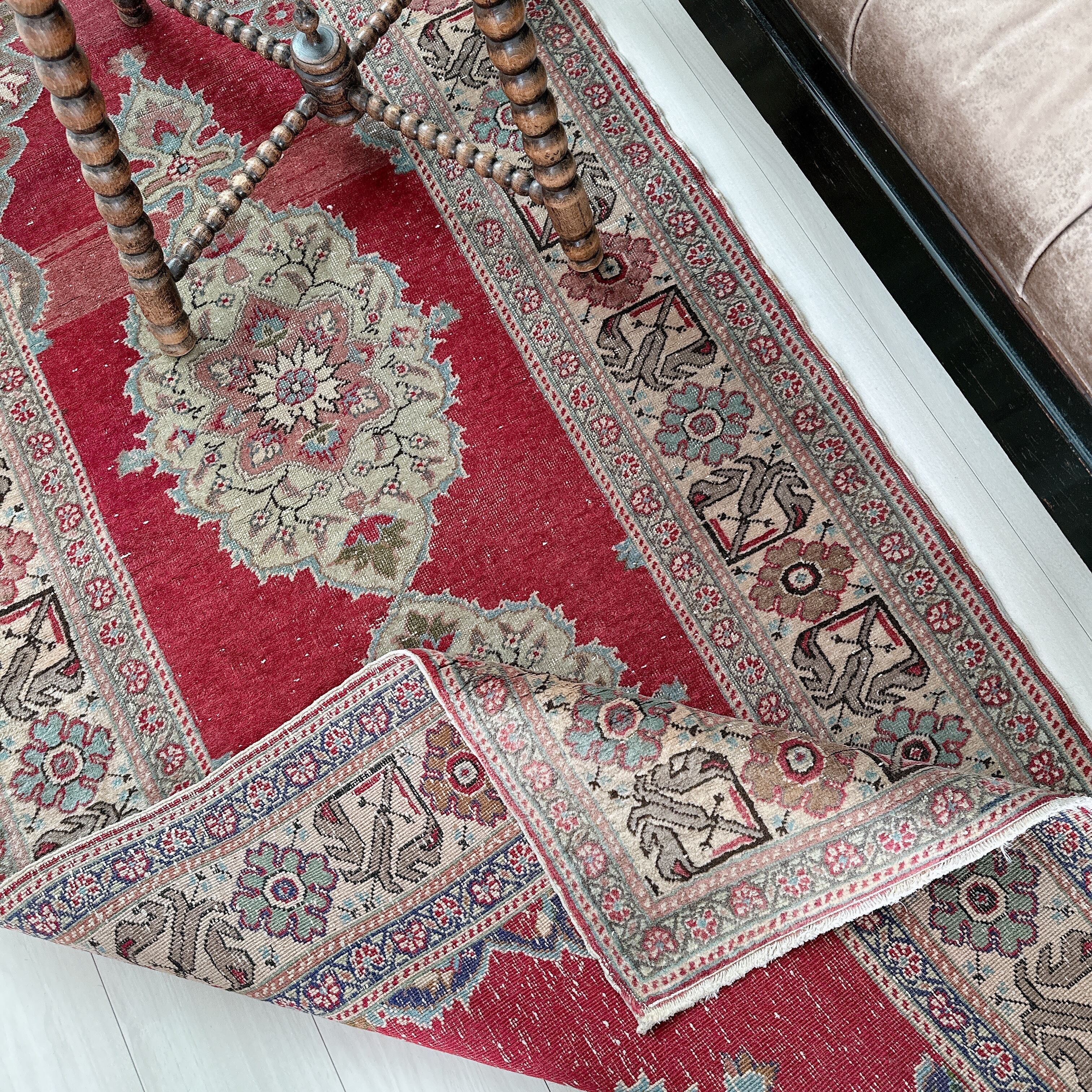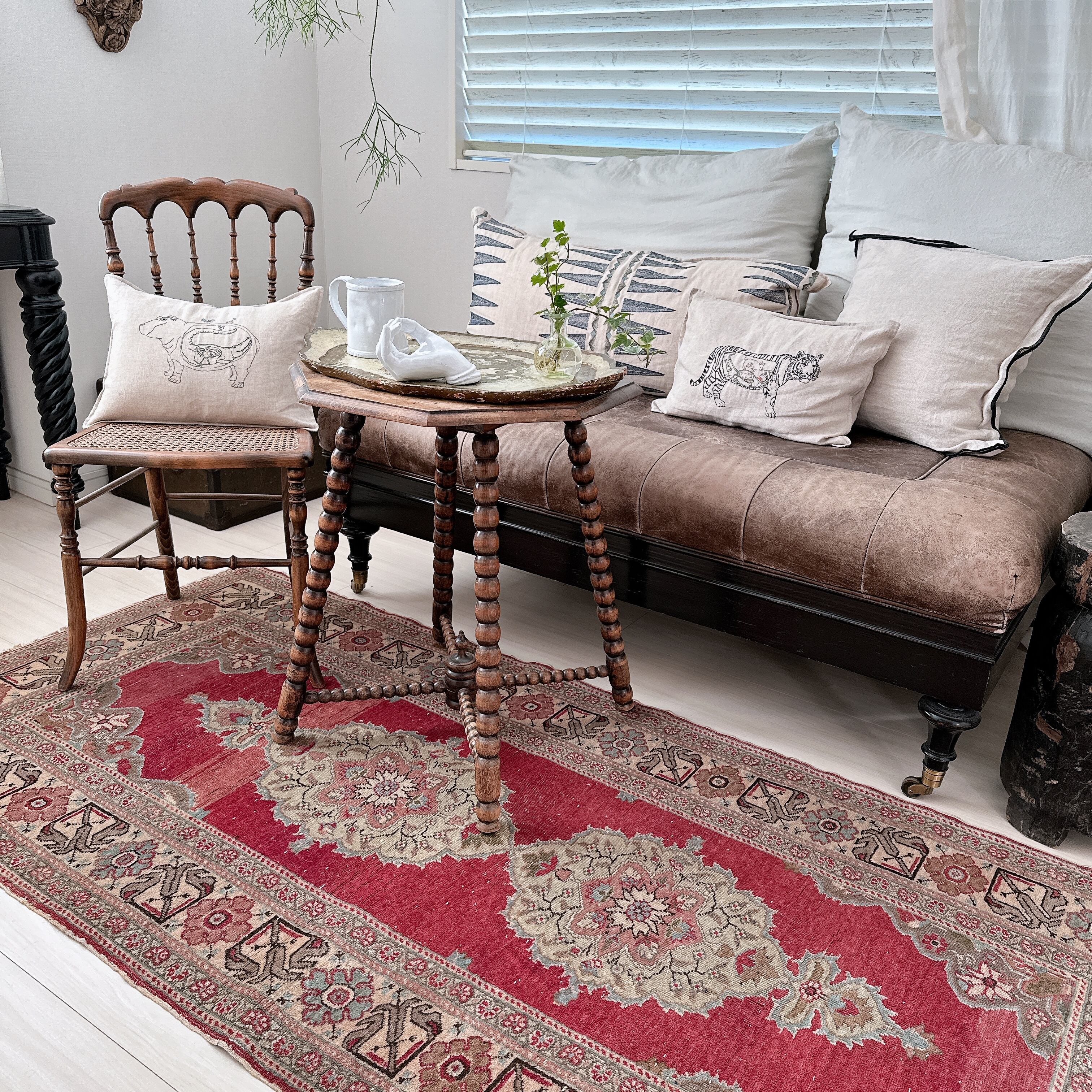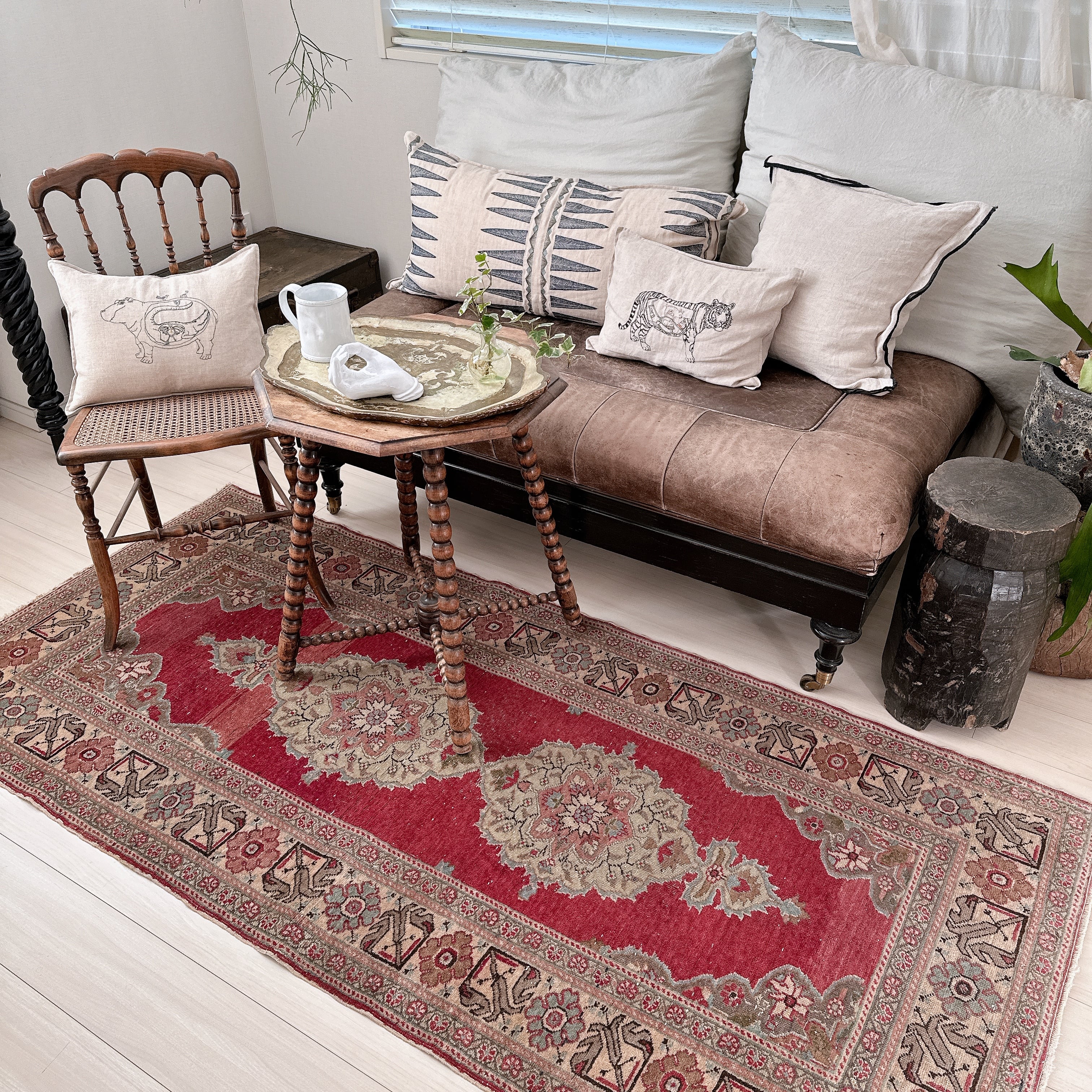 光の加減により赤の見え方が変化し、時間帯によって異なる表情を見せる点も、この年代のウールラグならではの魅力です。