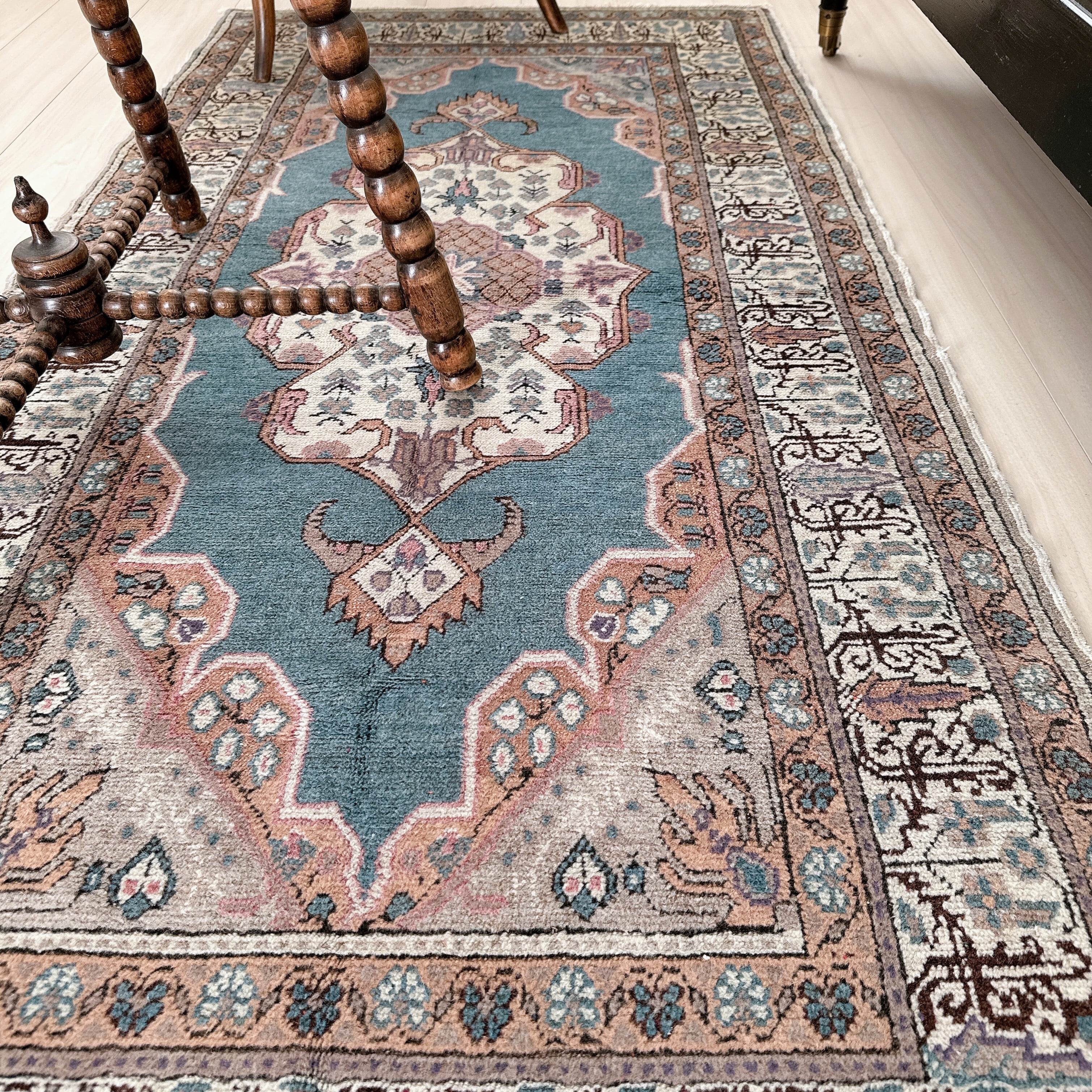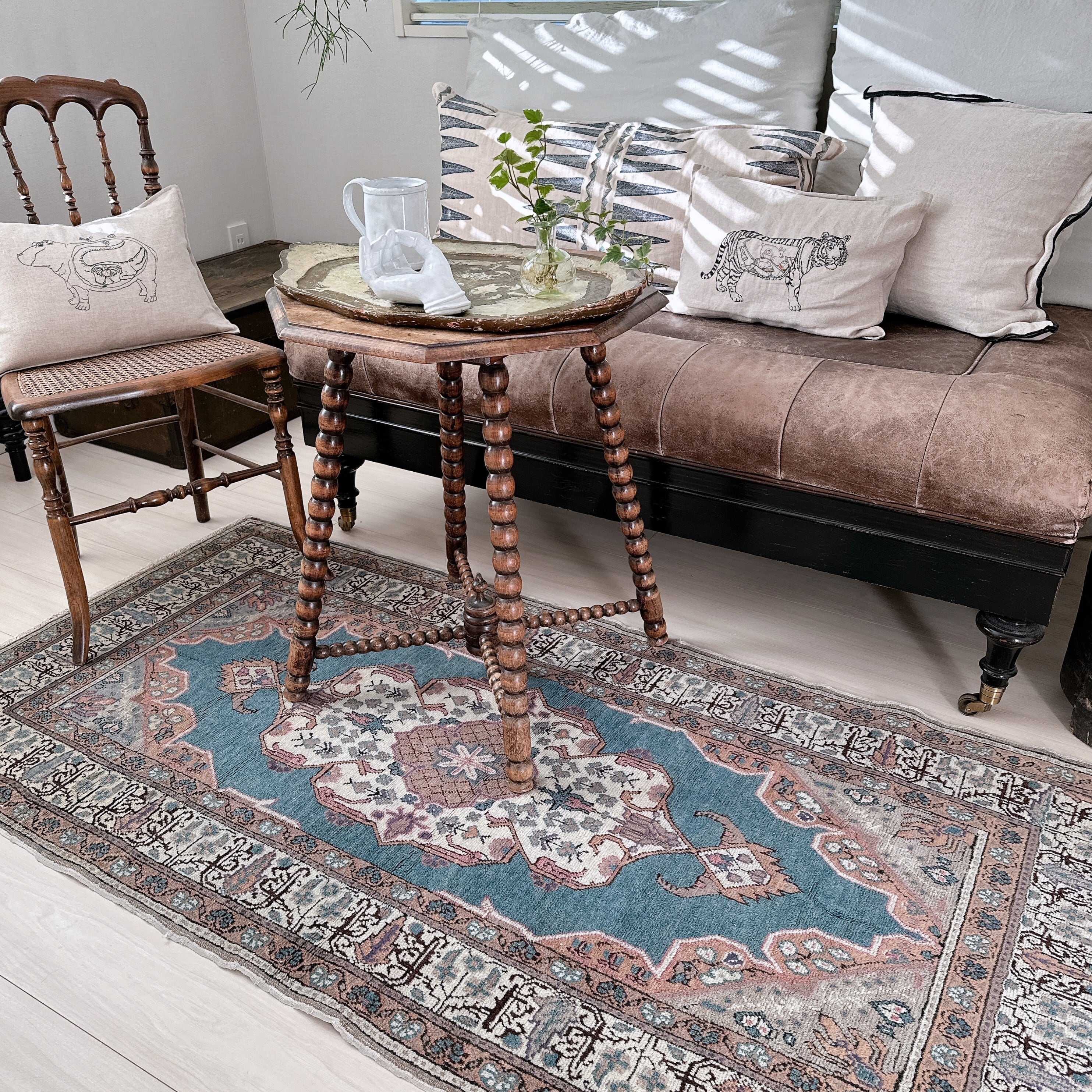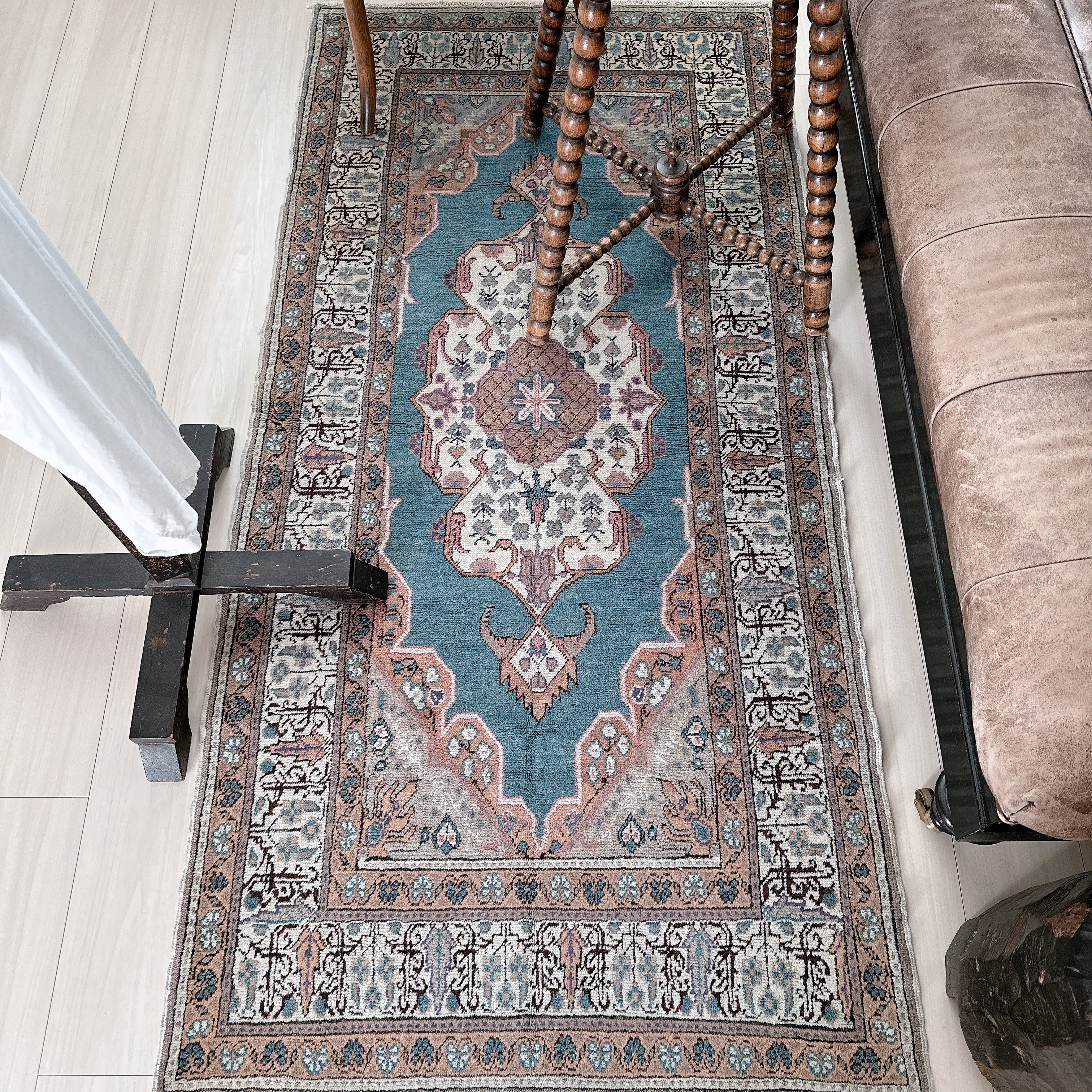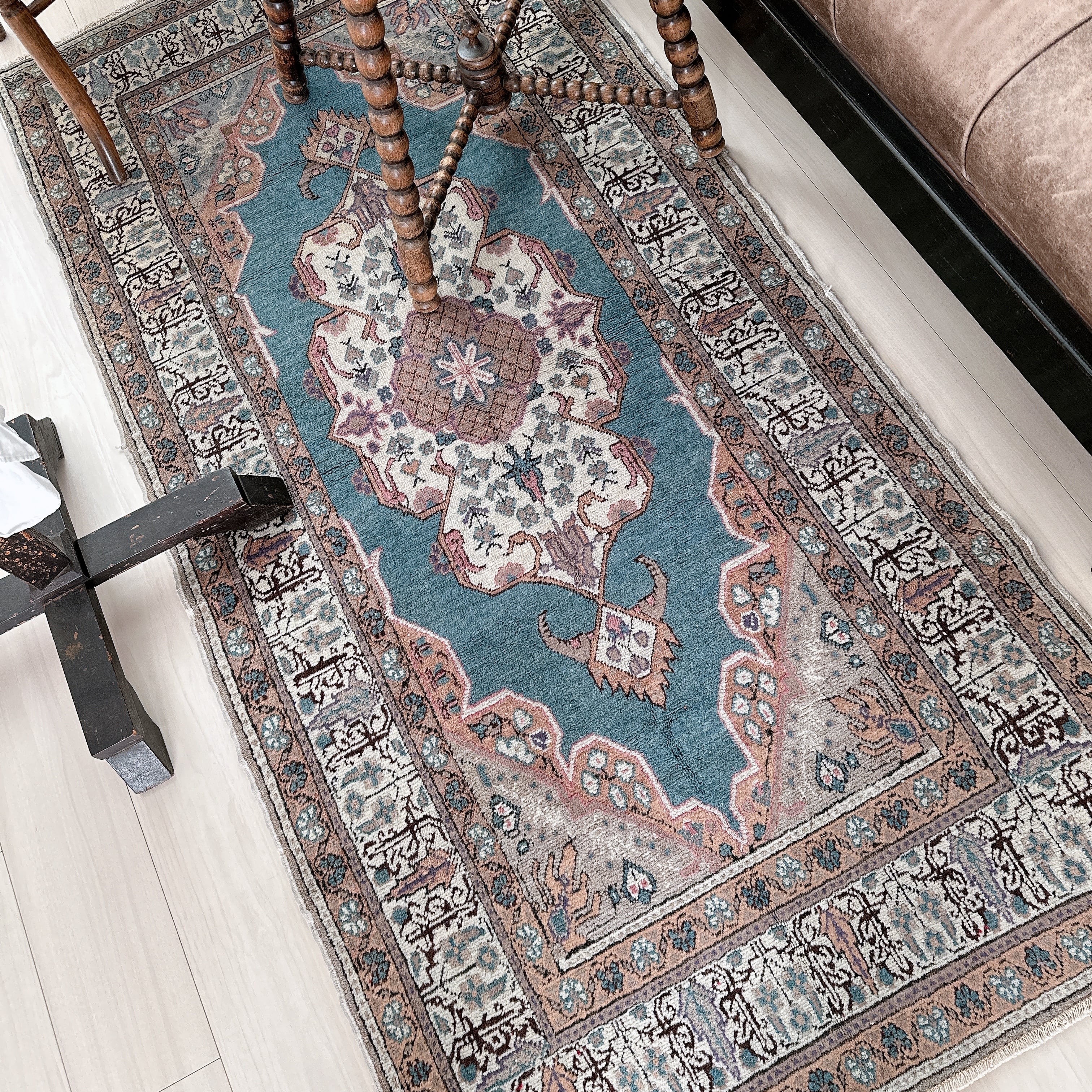 光の加減や時間帯によってブルーの見え方が僅かに変化し、ヴィンテージラグならではの静かな奥行きを楽しめる一枚です。
