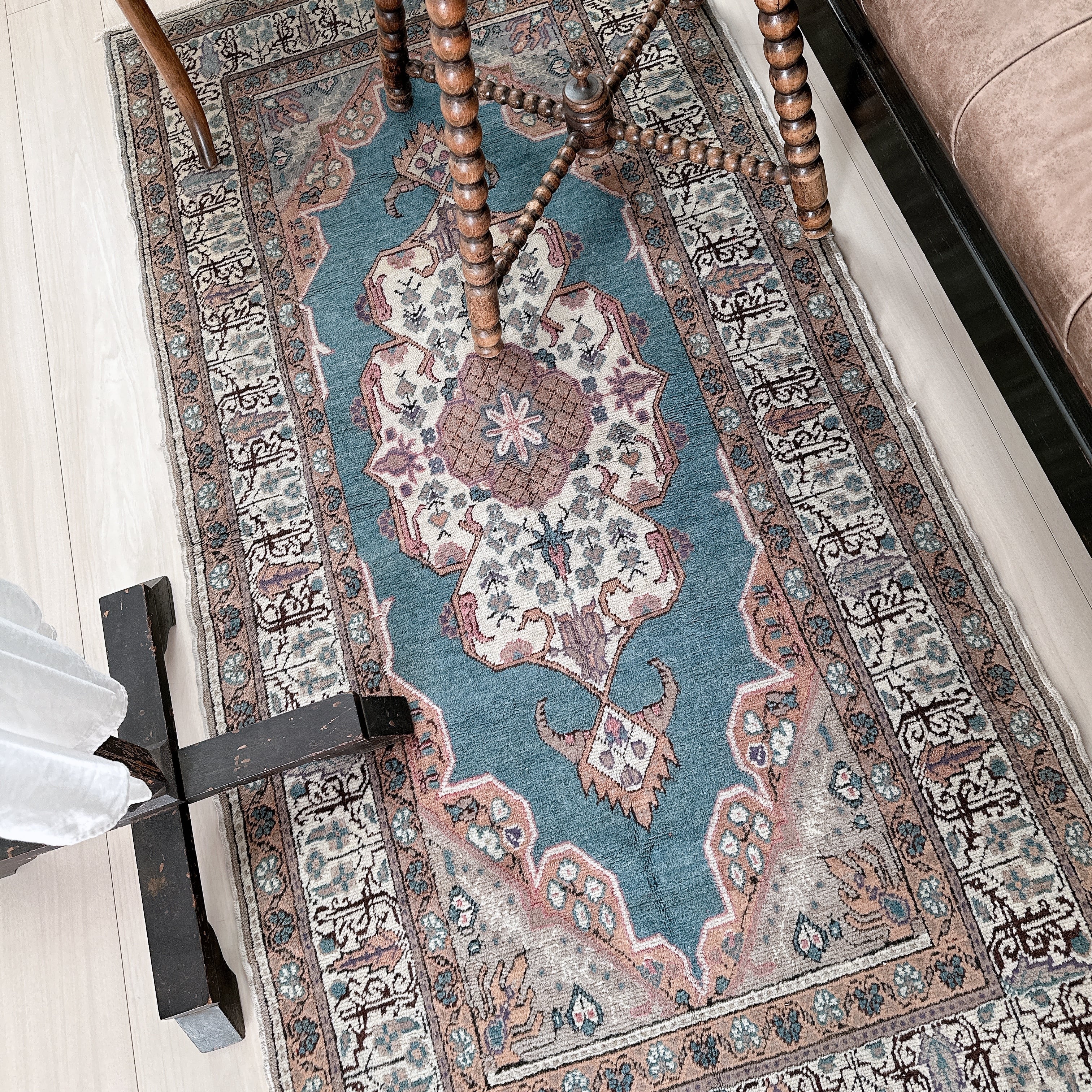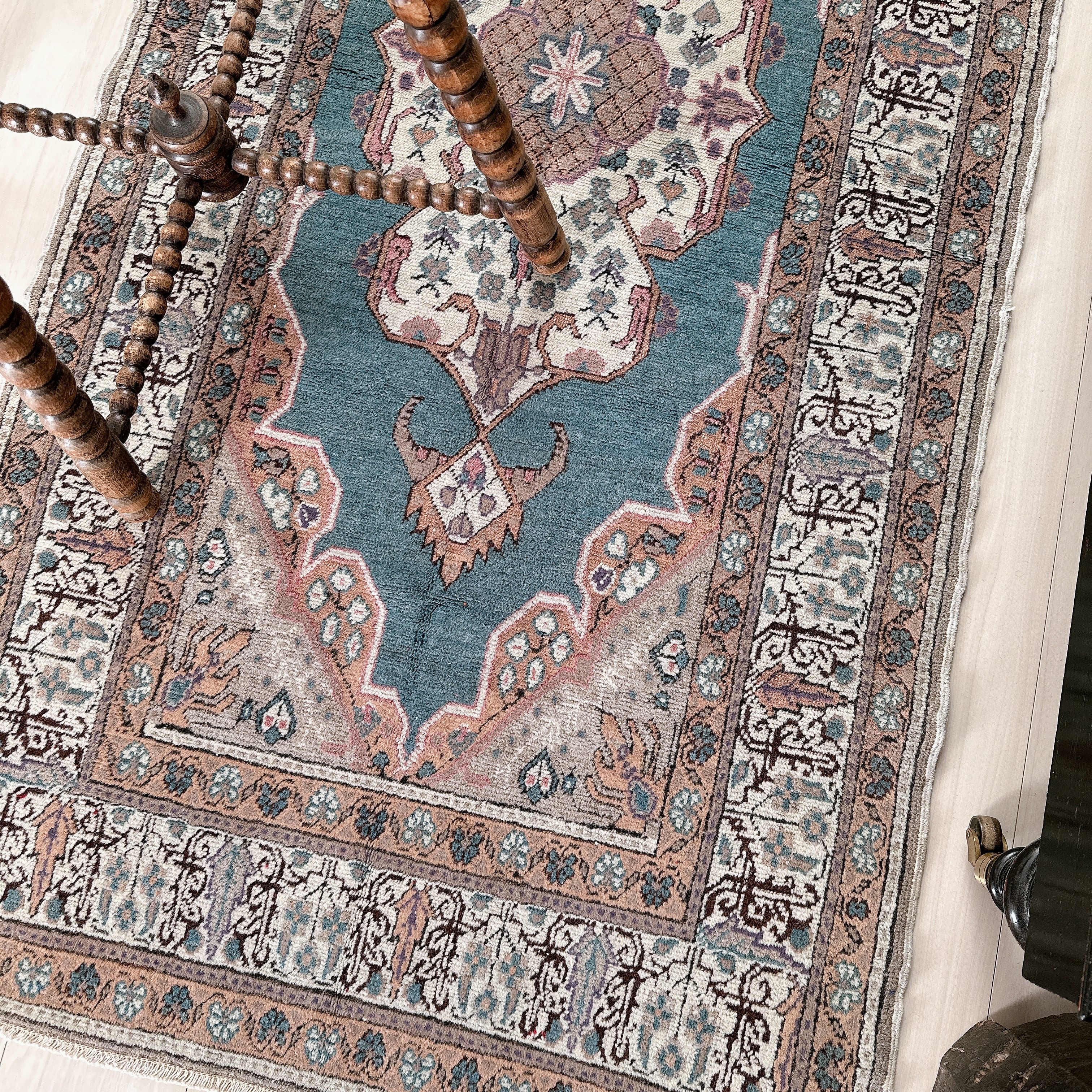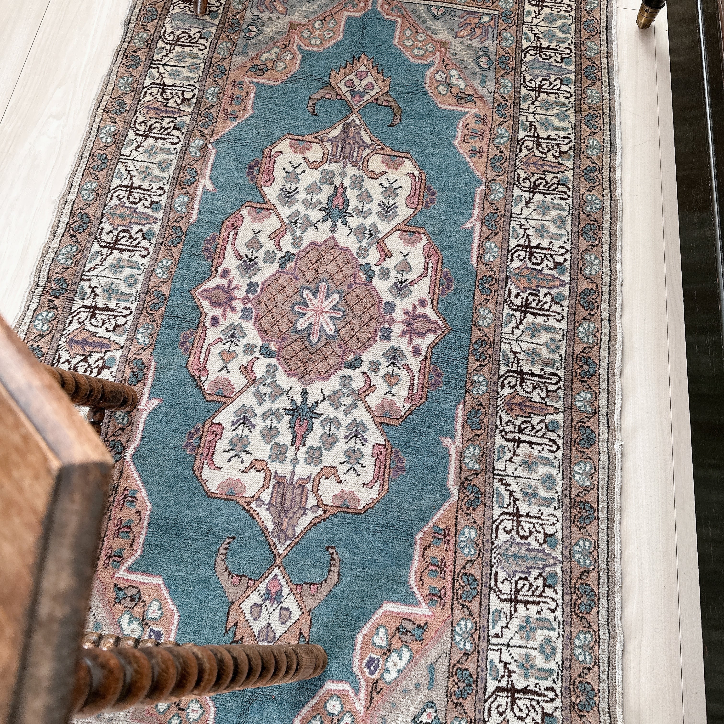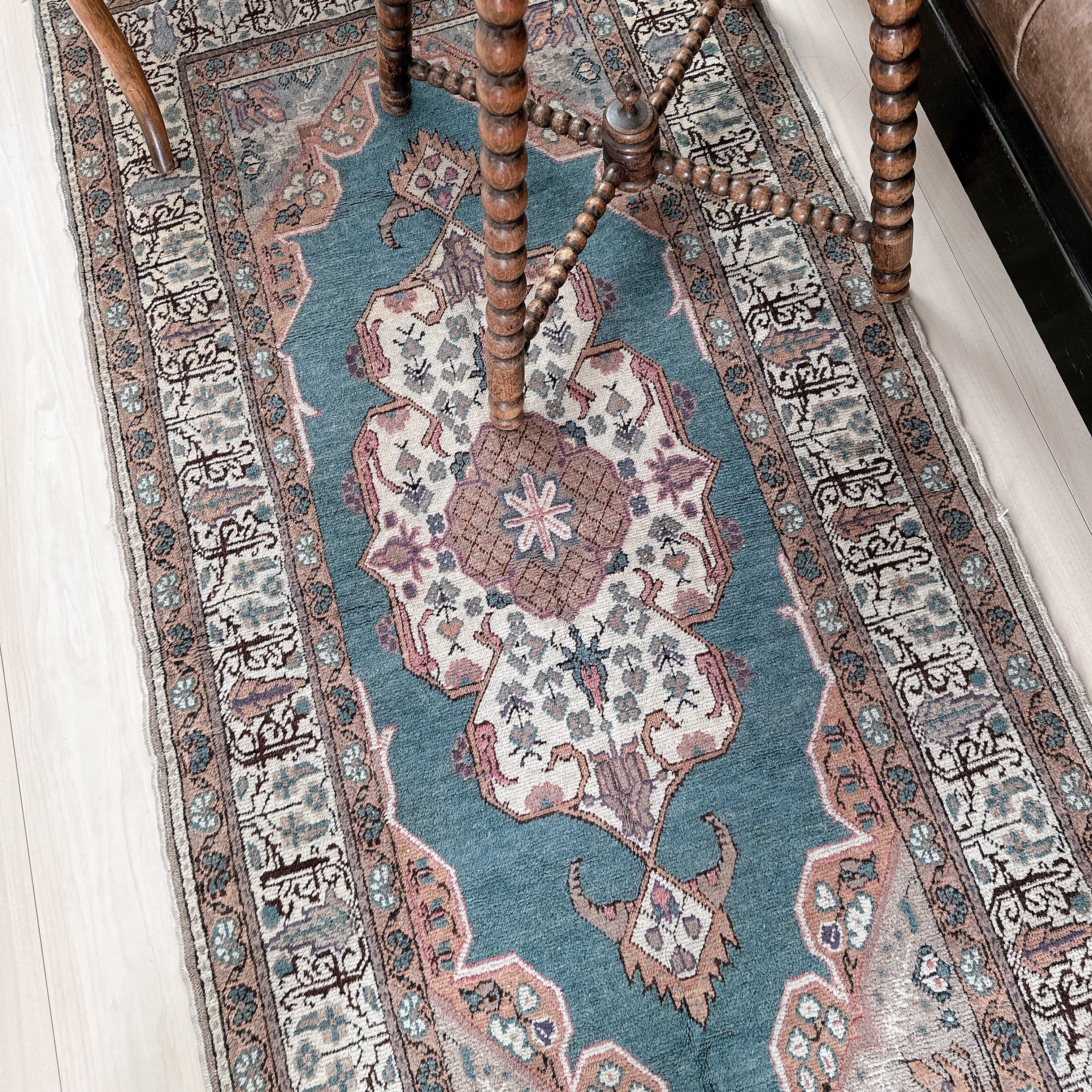 光の加減や時間帯によってブルーの見え方が僅かに変化し、ヴィンテージラグならではの静かな奥行きを楽しめる一枚です。