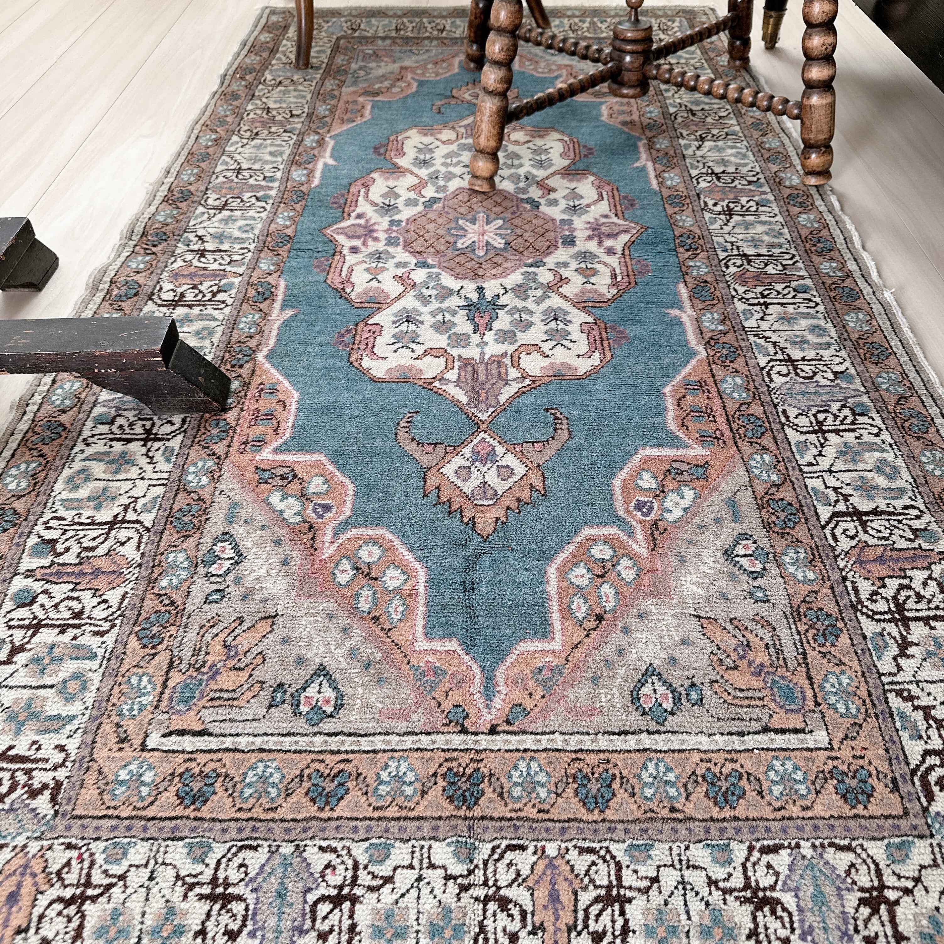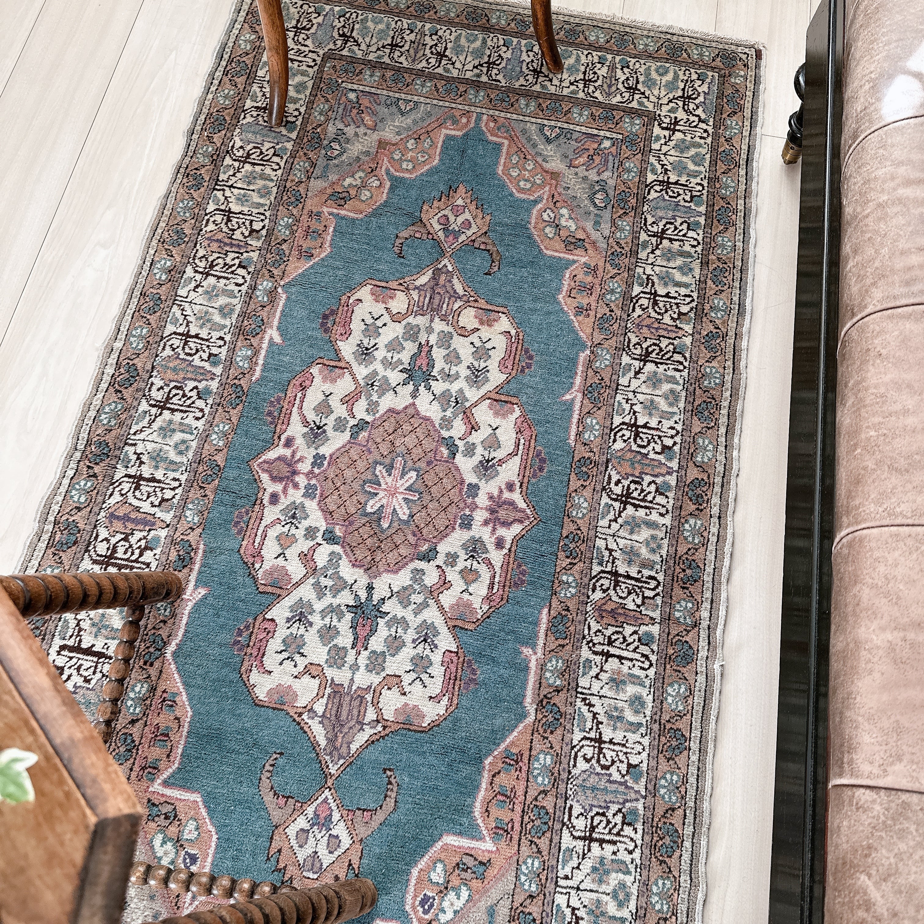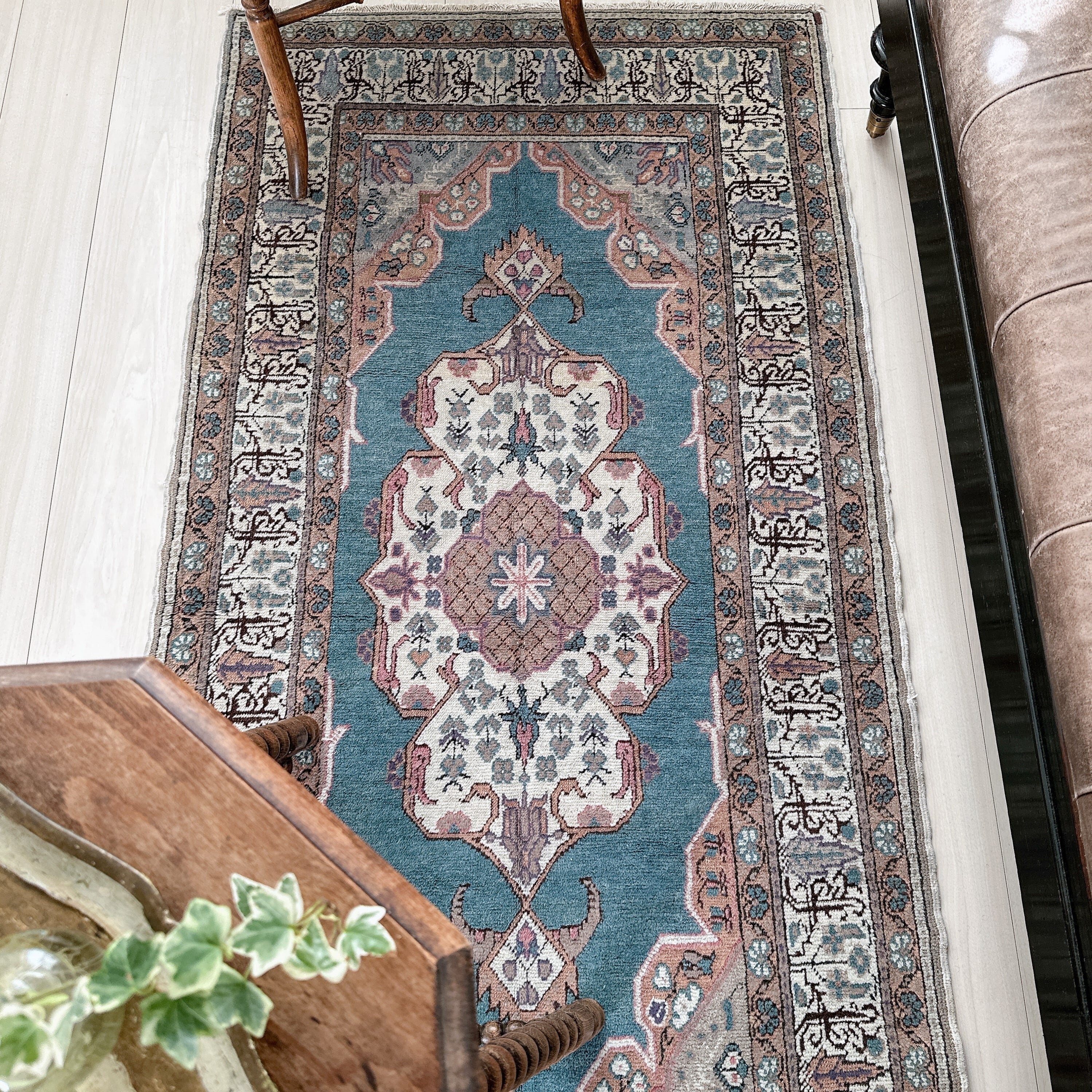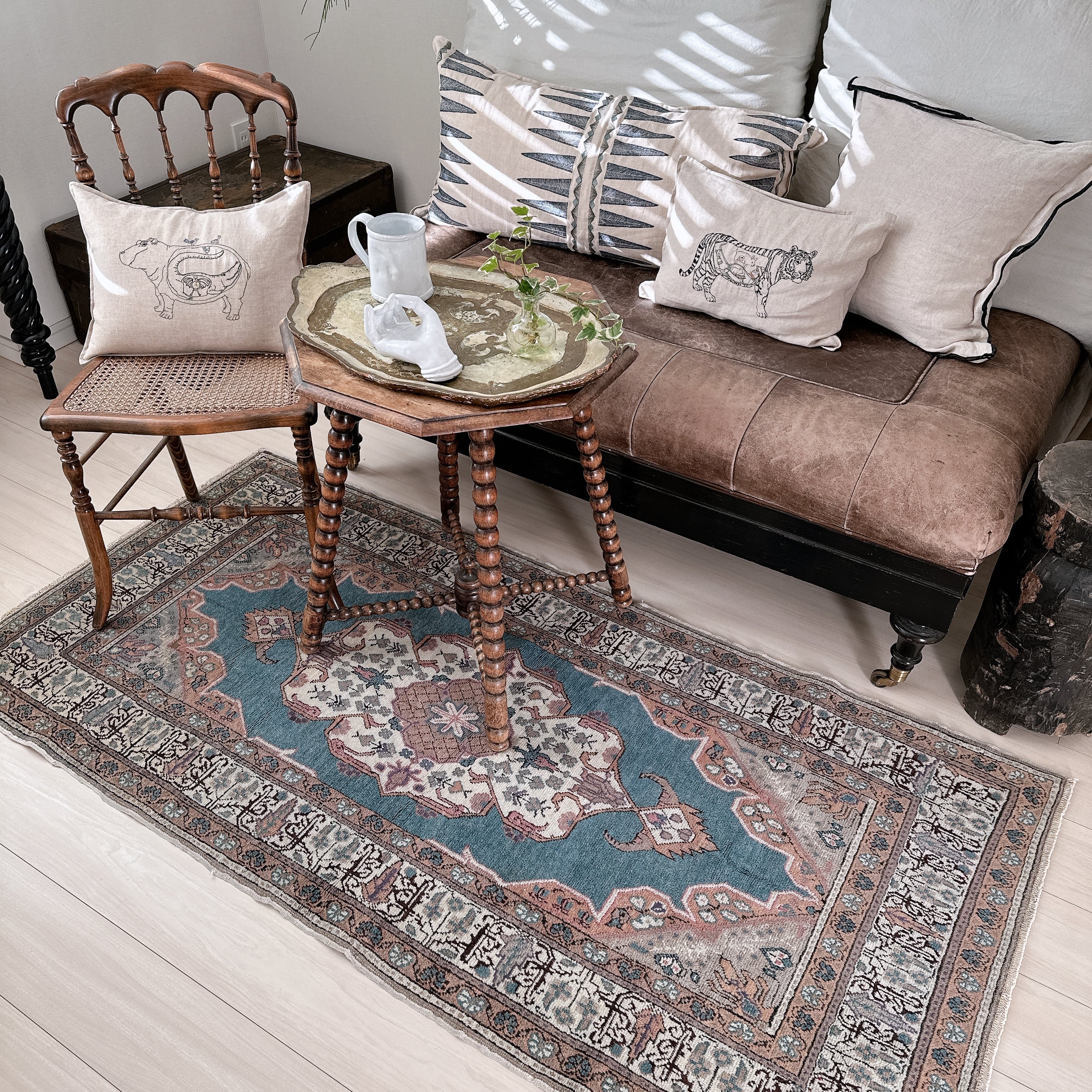 光の加減や時間帯によってブルーの見え方が僅かに変化し、ヴィンテージラグならではの静かな奥行きを楽しめる一枚です。