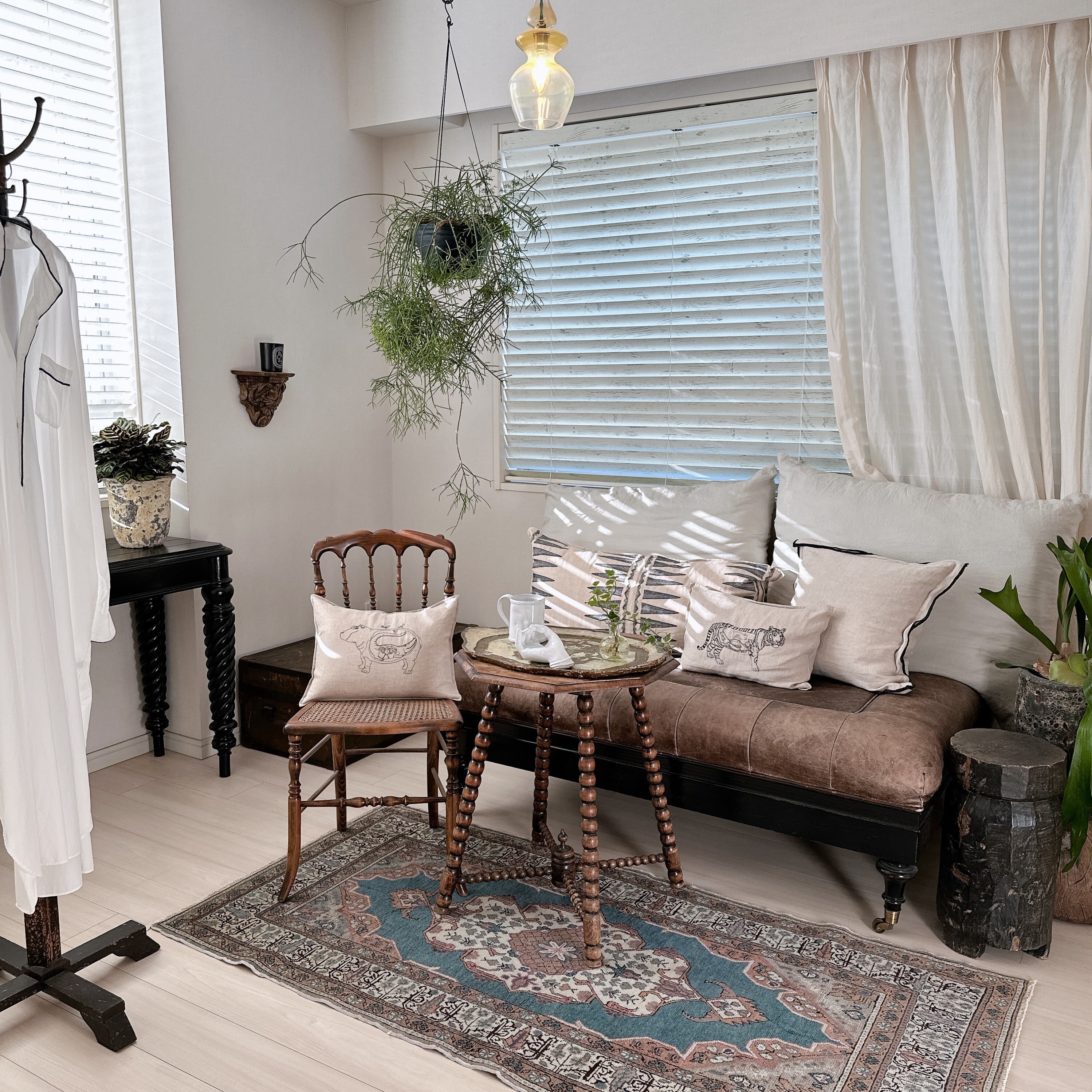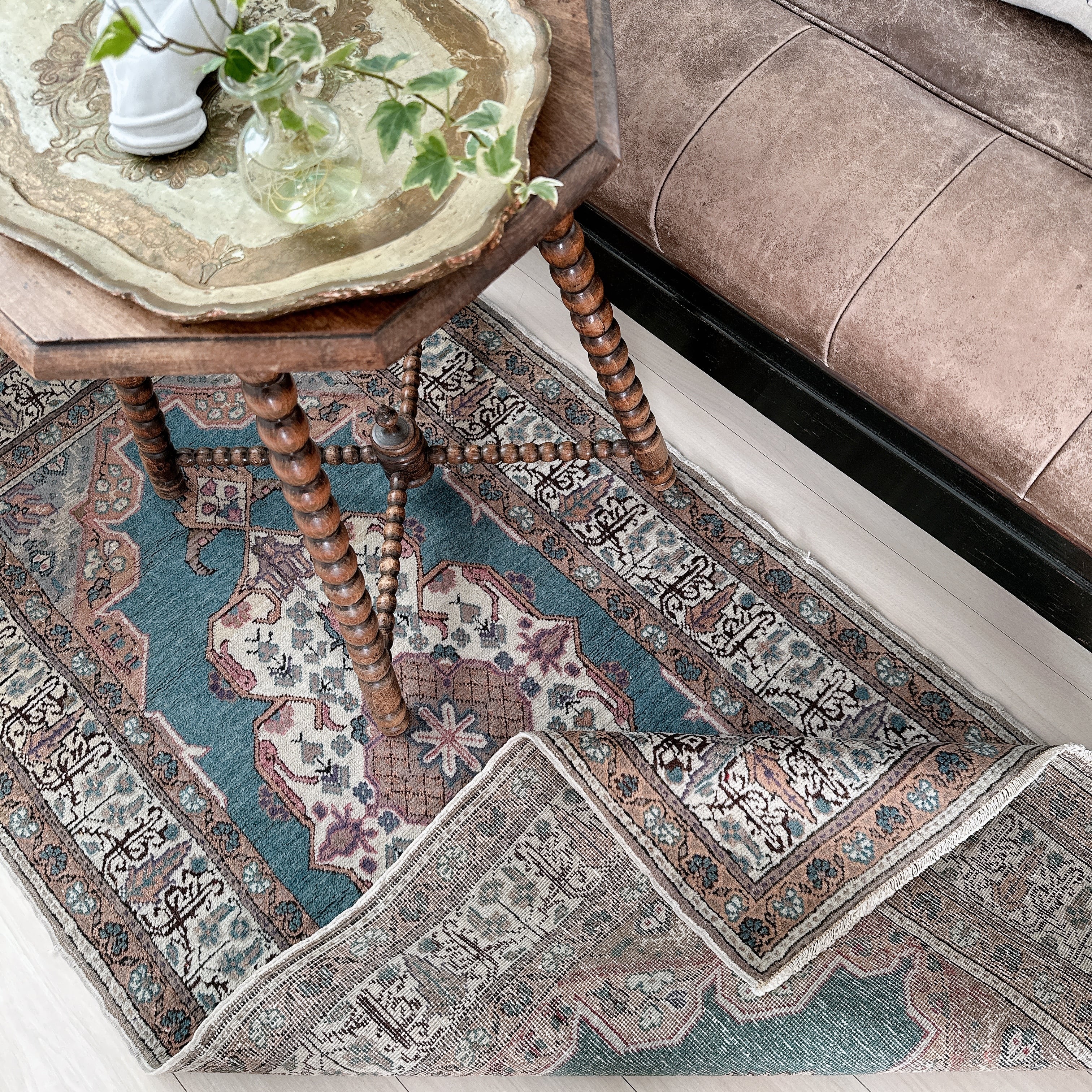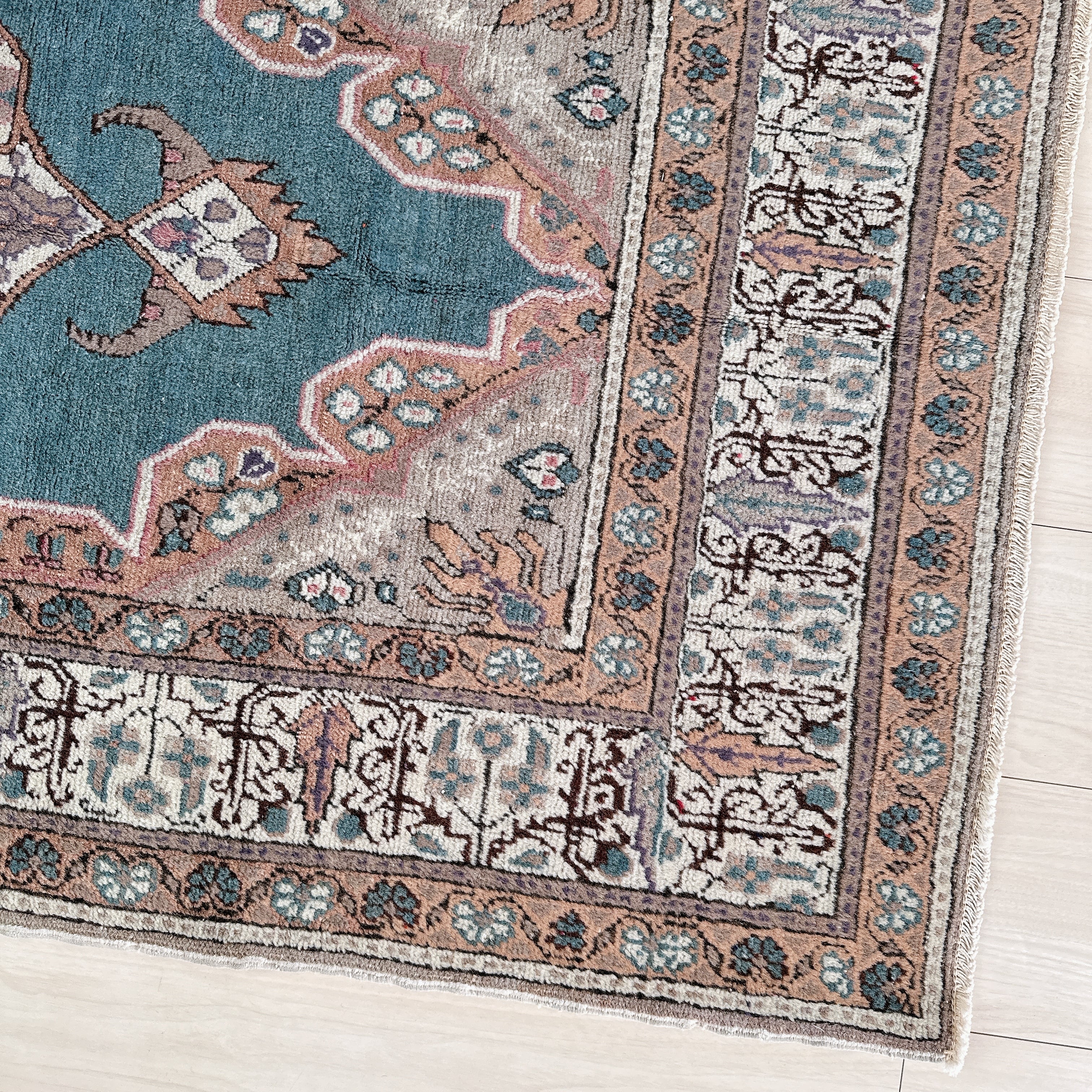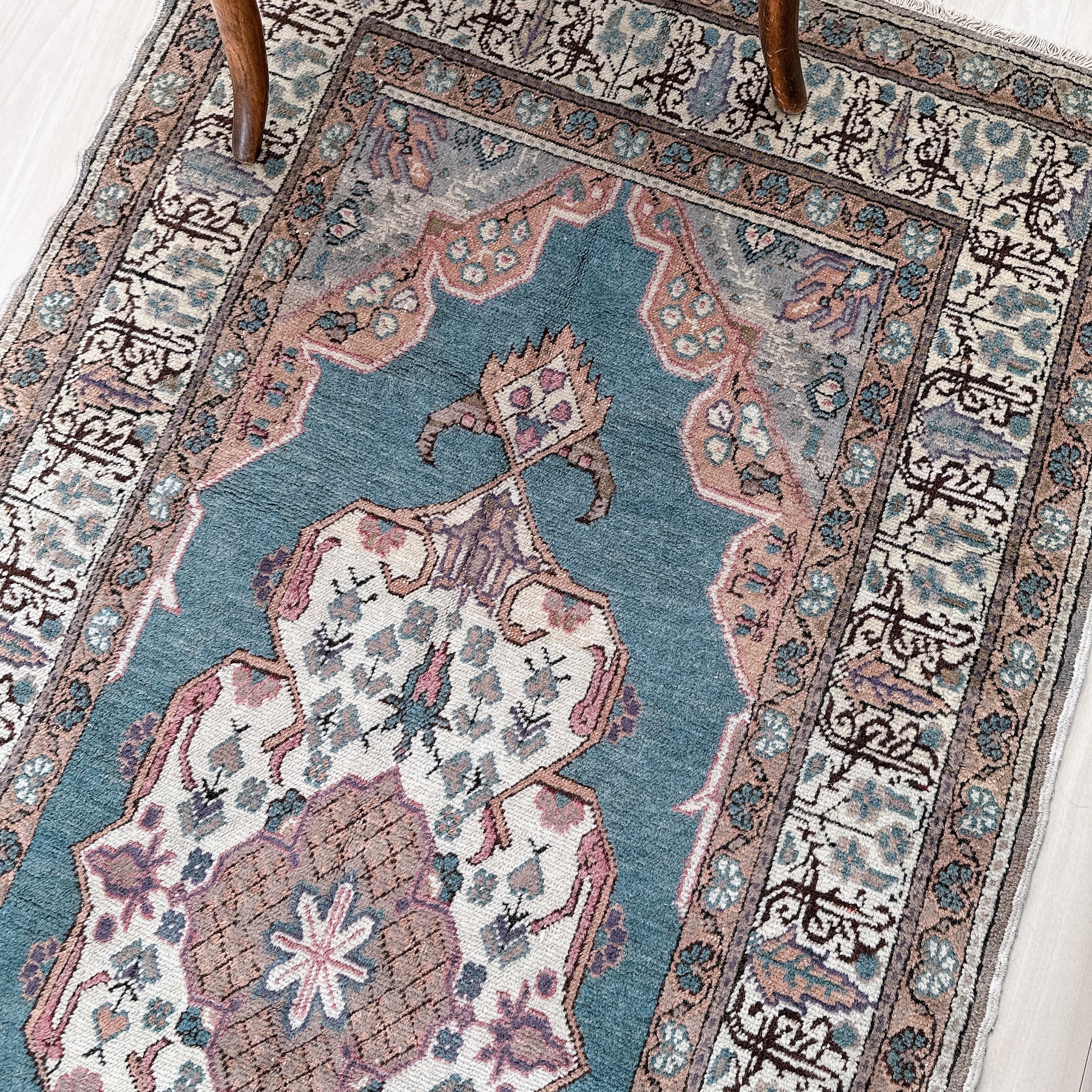 光の加減や時間帯によってブルーの見え方が僅かに変化し、ヴィンテージラグならではの静かな奥行きを楽しめる一枚です。
