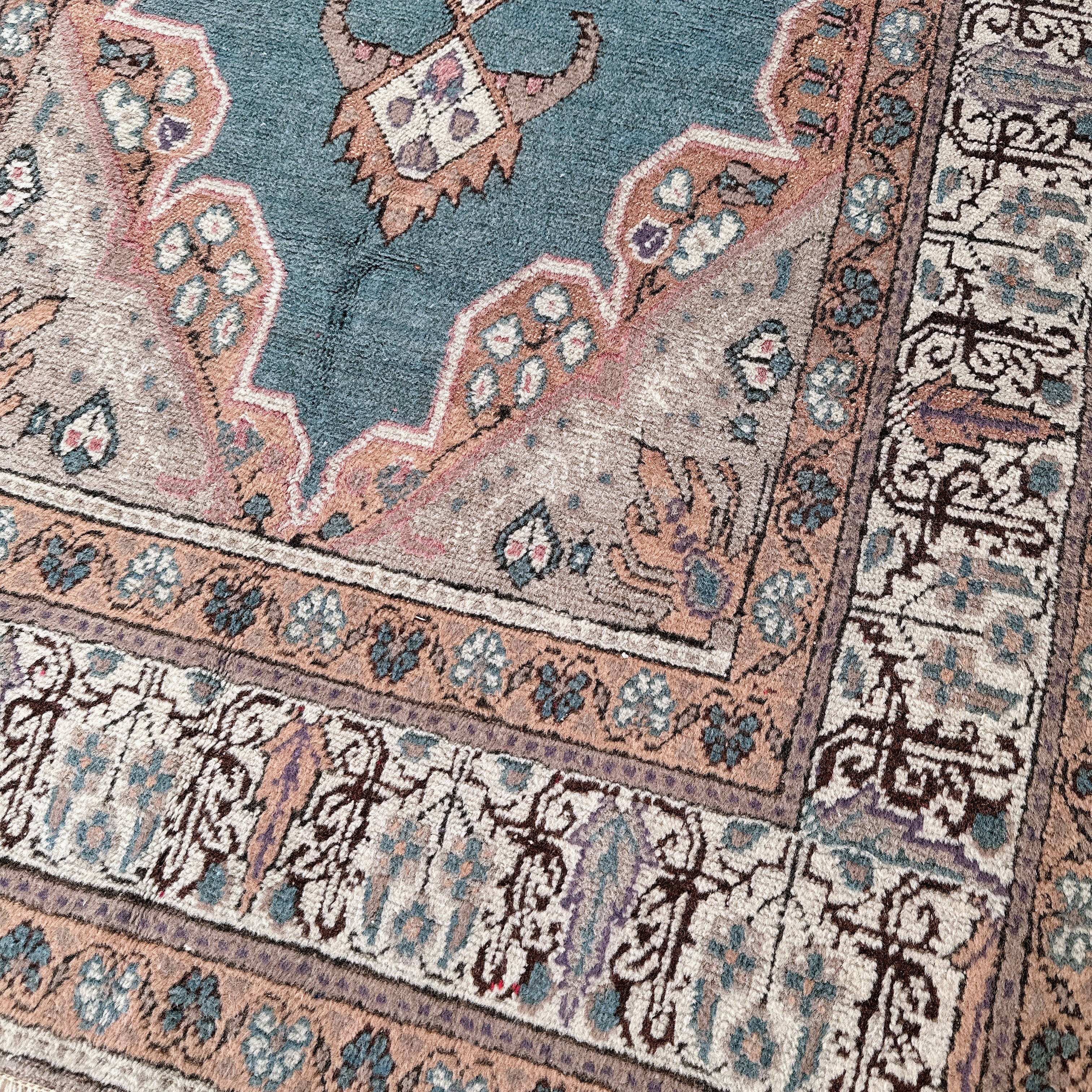 ボーダー(縁取り)には細かなフローラルモチーフや蔓草の文様が丁寧に織り込まれ、カイセリならではの細密織の美しさと、ウール特有のしっとりとした艶が穏やかに調和しています。