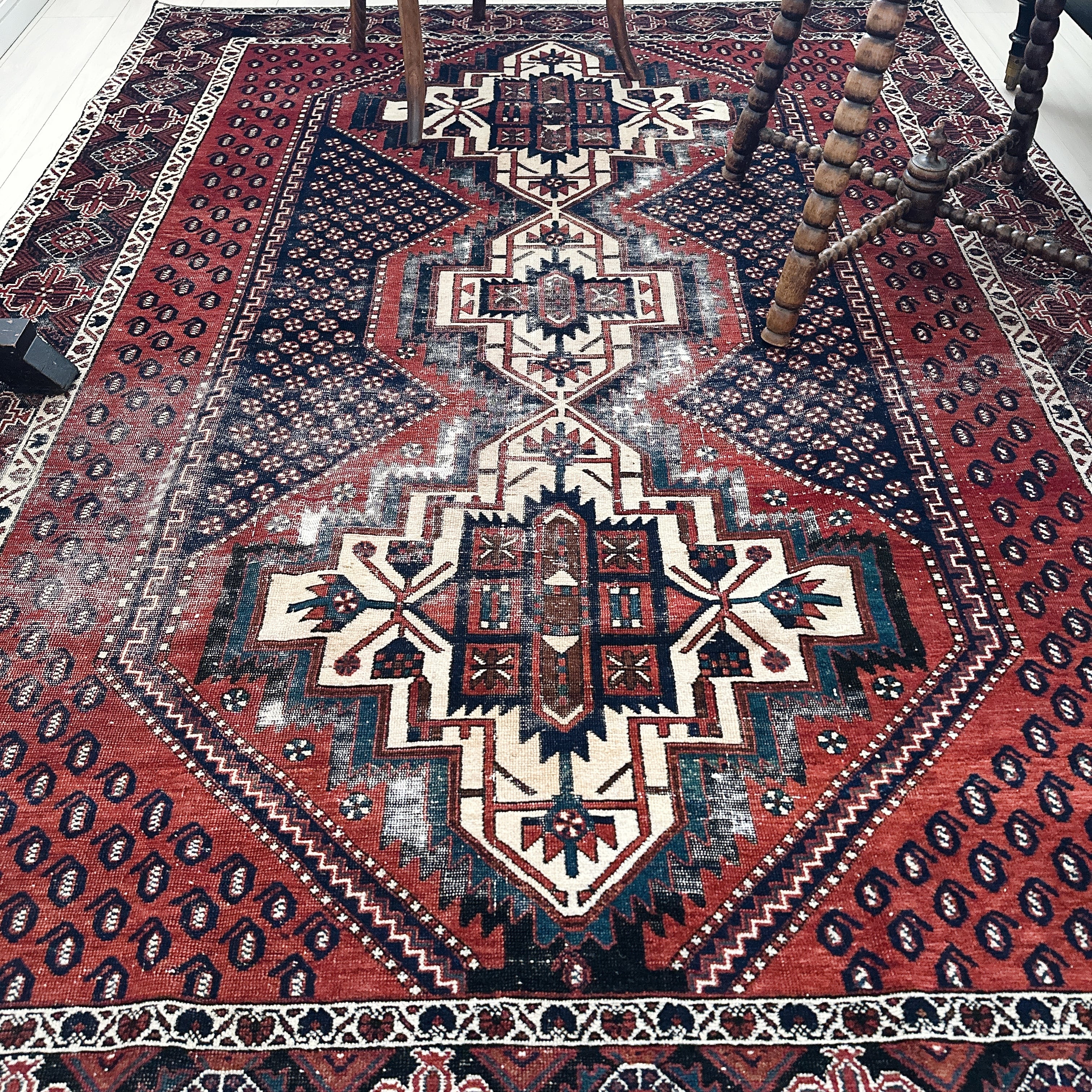 こちらは中央に大きなメダリオンが連なり、トルコラグの伝統的な幾何学模様が織り込まれています。