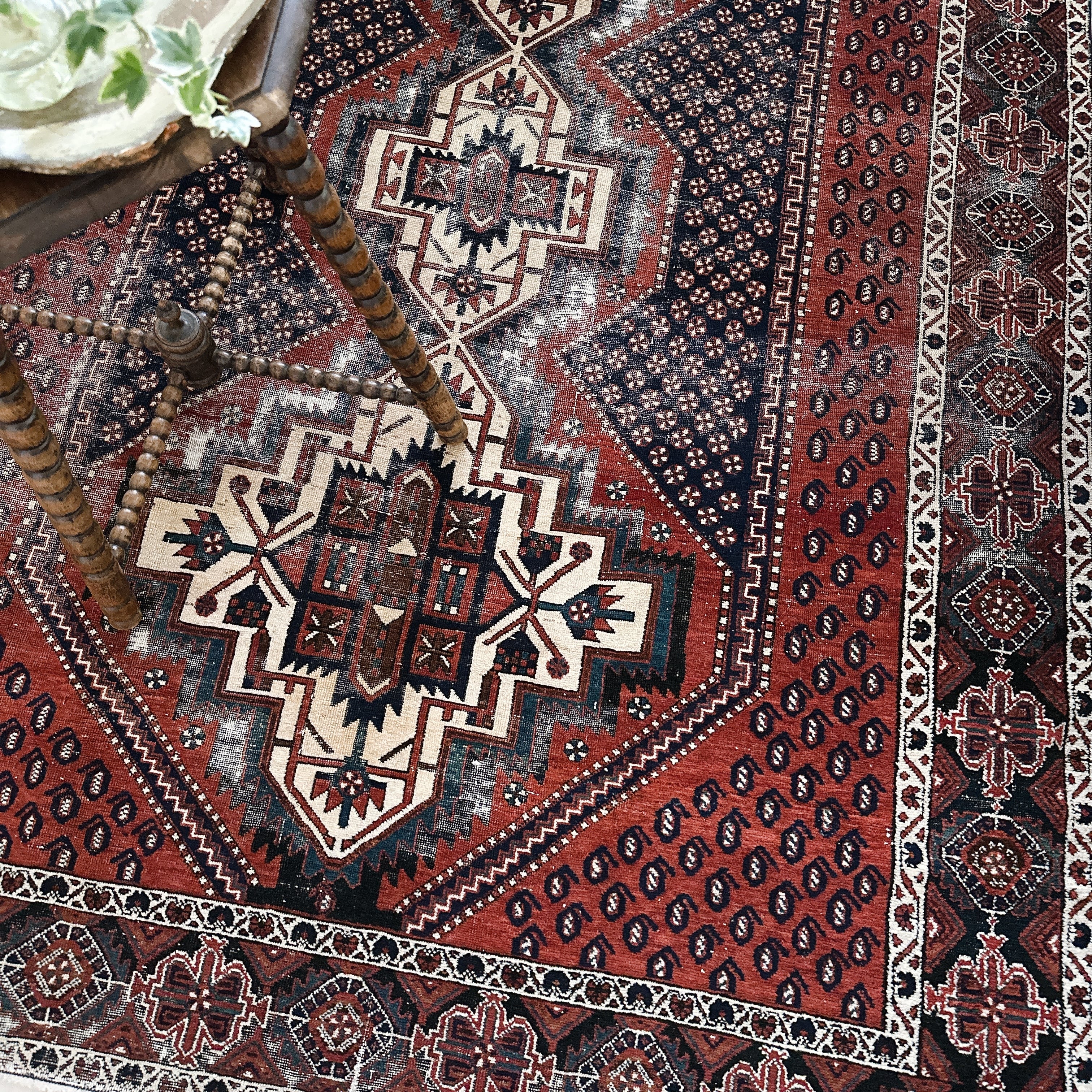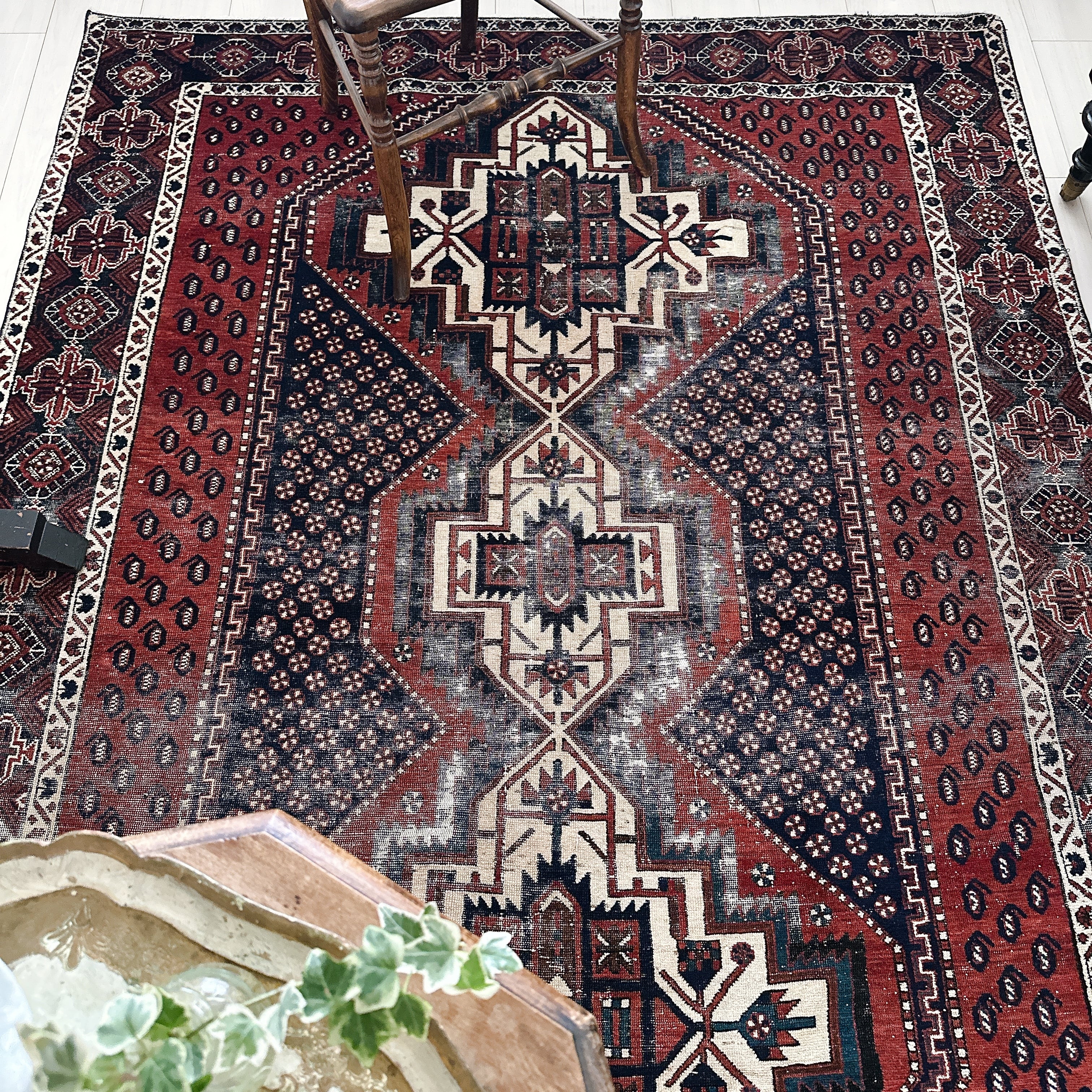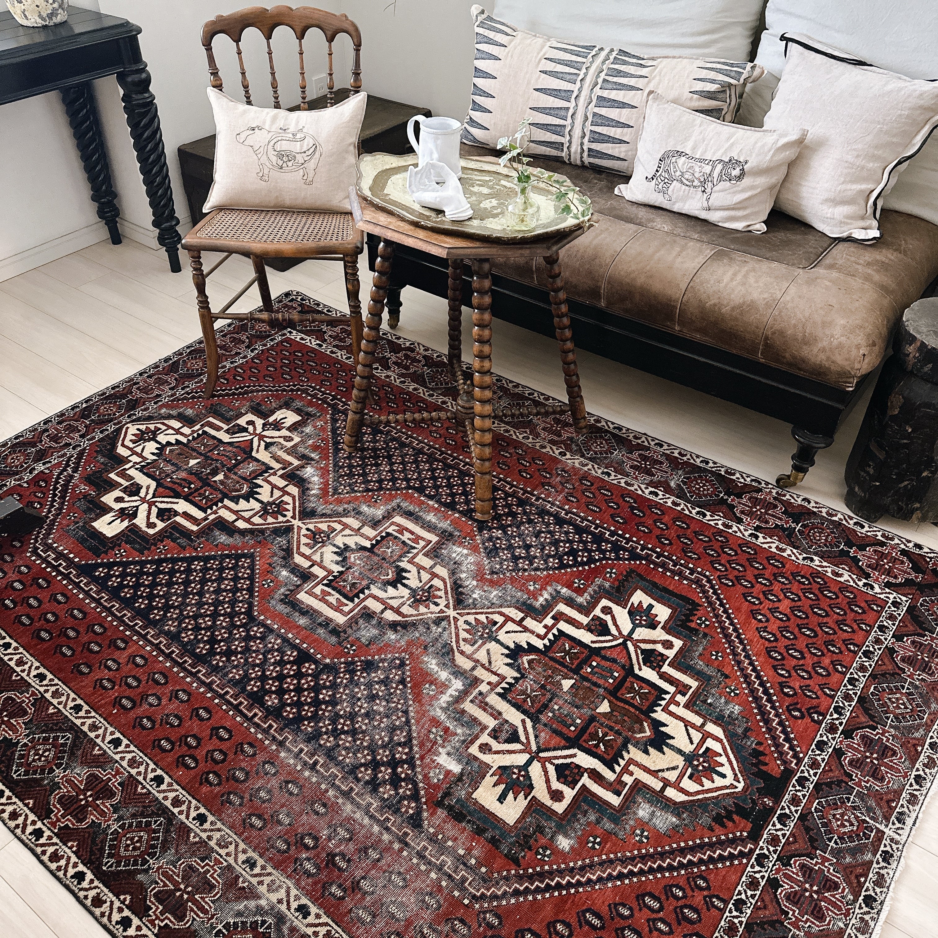 カラーはブラウンを帯びたダークレッドとダークネイビーを中心に構成されており、経年変化によって現れた自然なフェードが美しく、当時の手織りならではの空気感を残しています。