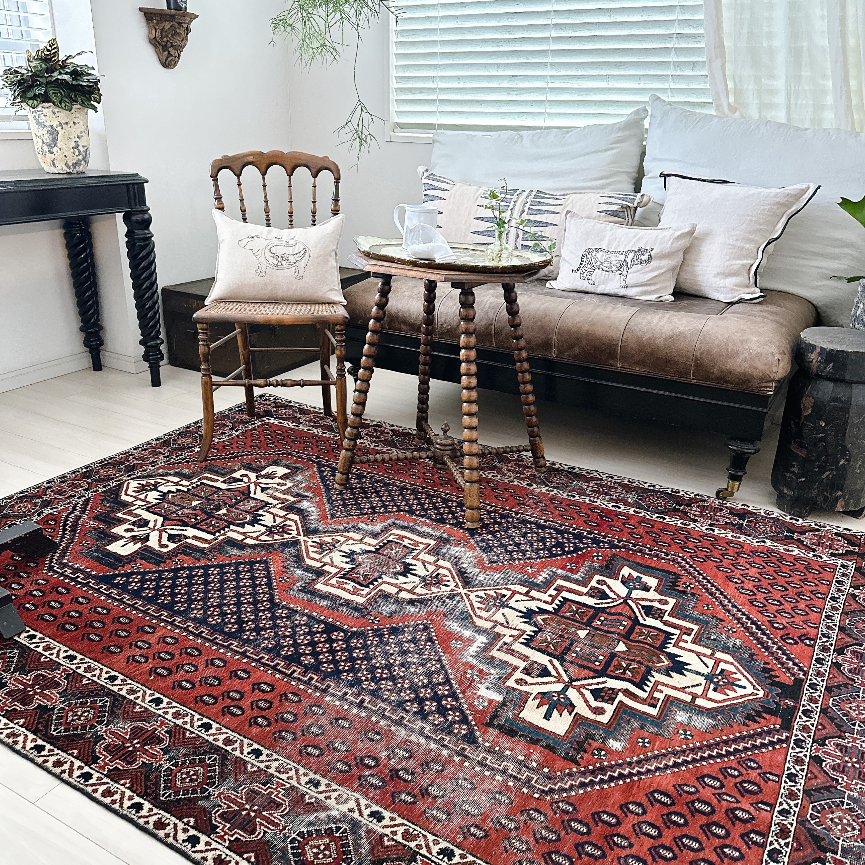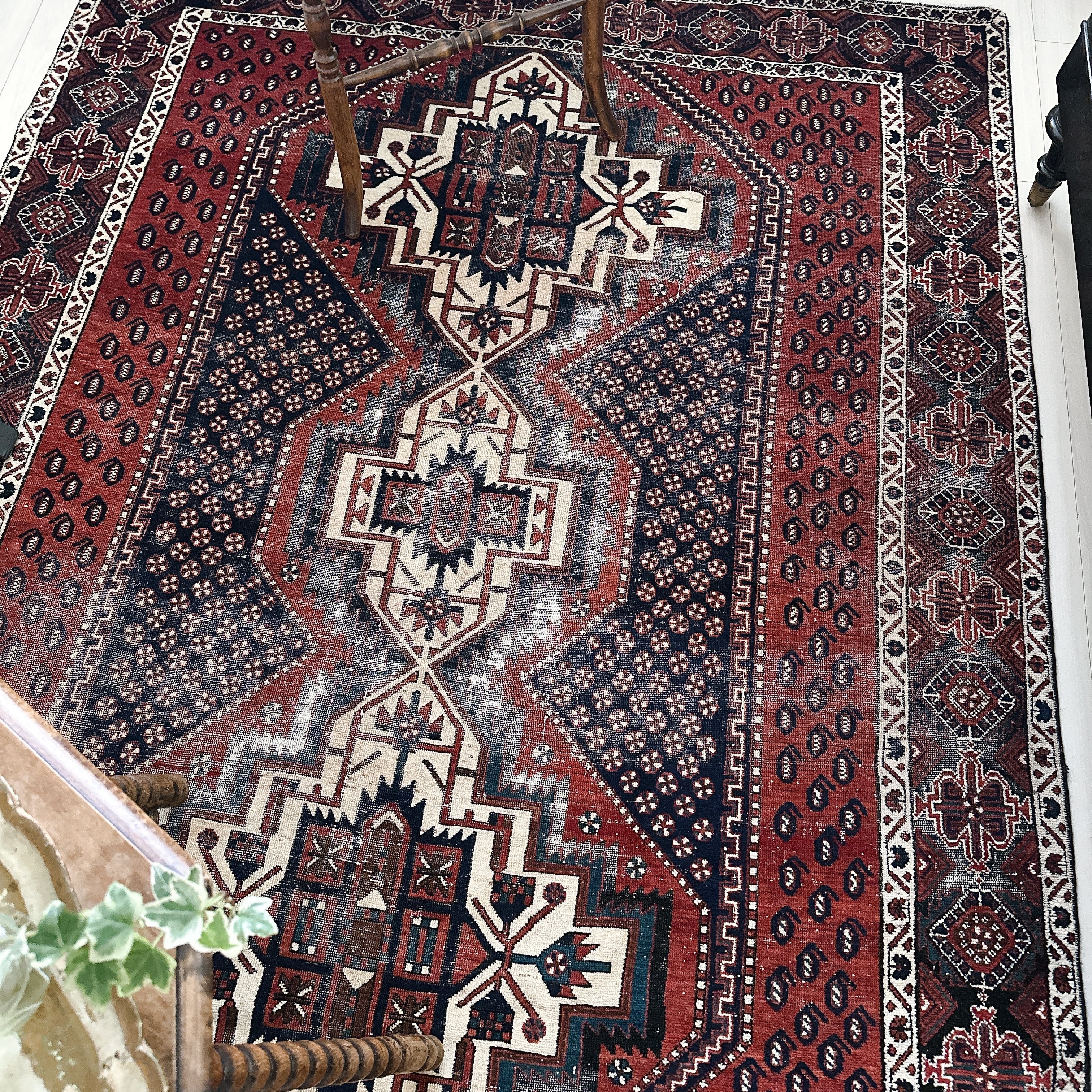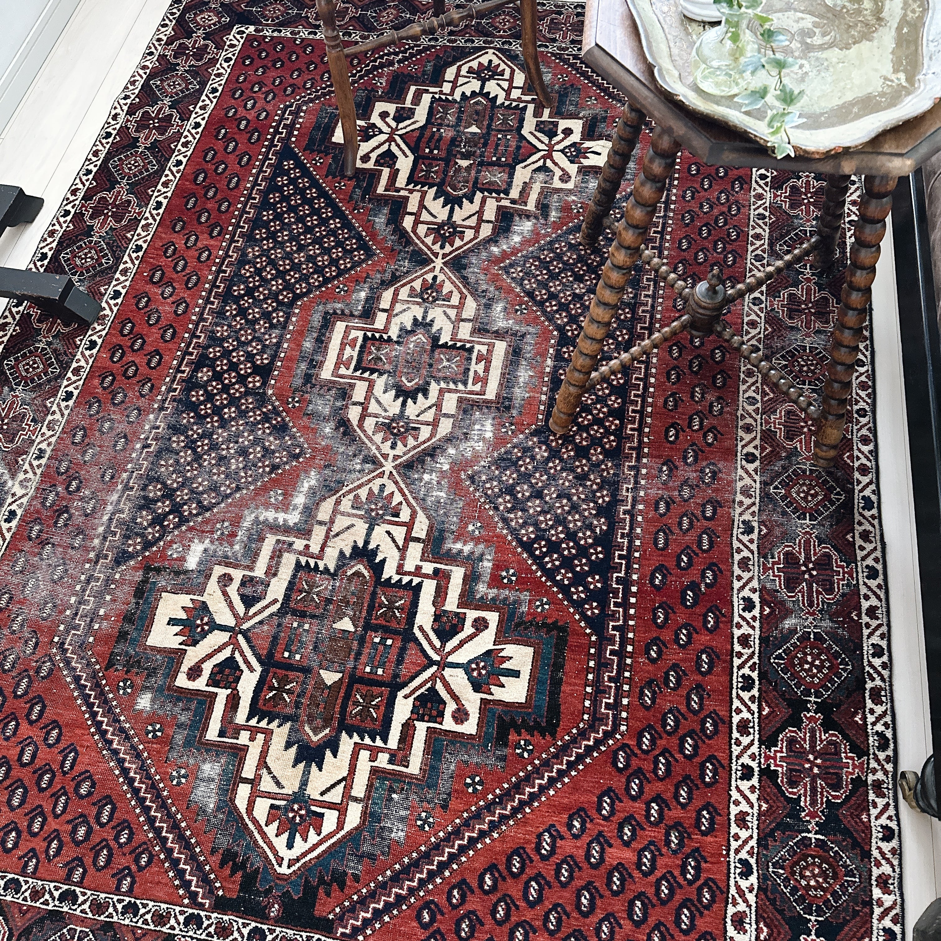 カラーはブラウンを帯びたダークレッドとダークネイビーを中心に構成されており、経年変化によって現れた自然なフェードが美しく、当時の手織りならではの空気感を残しています。