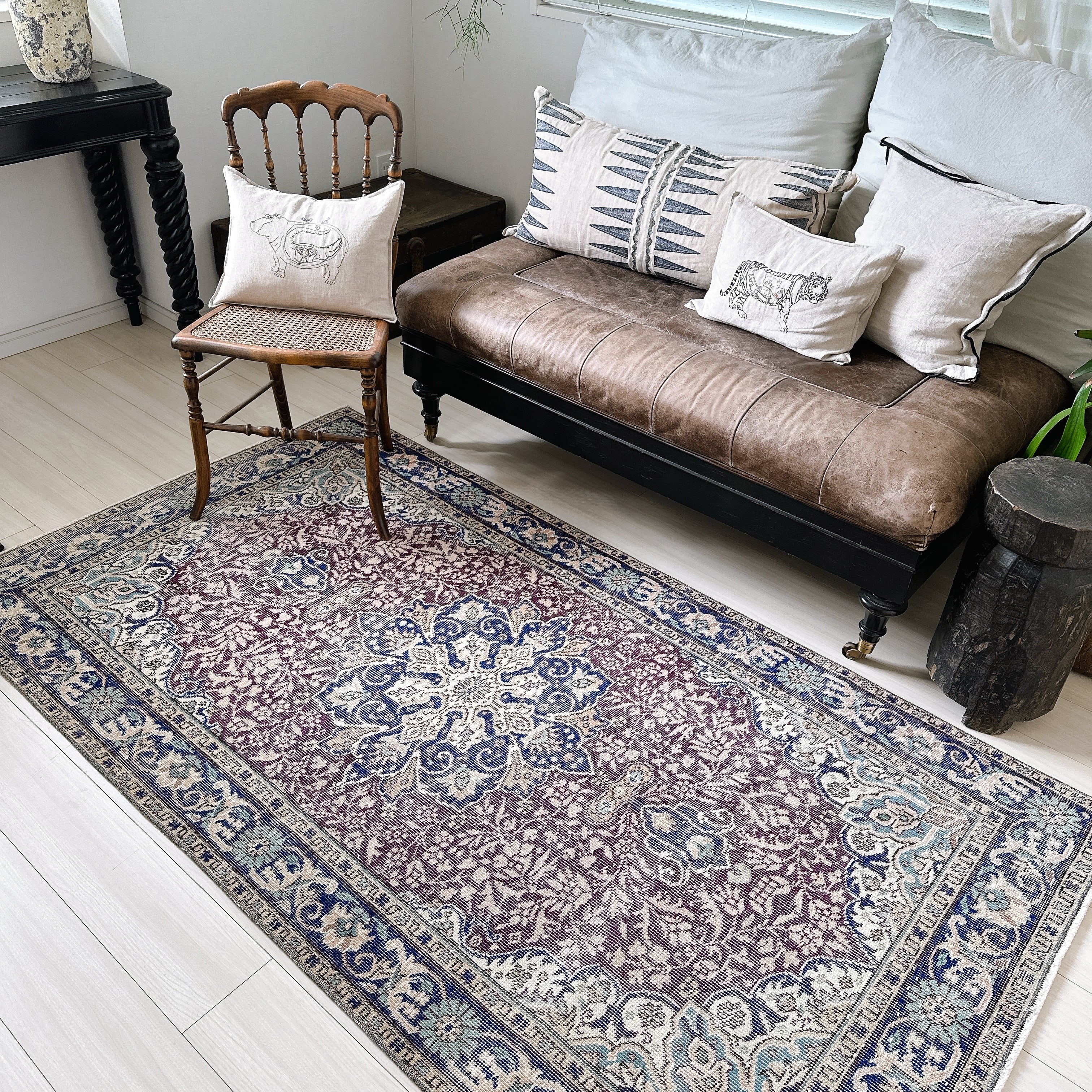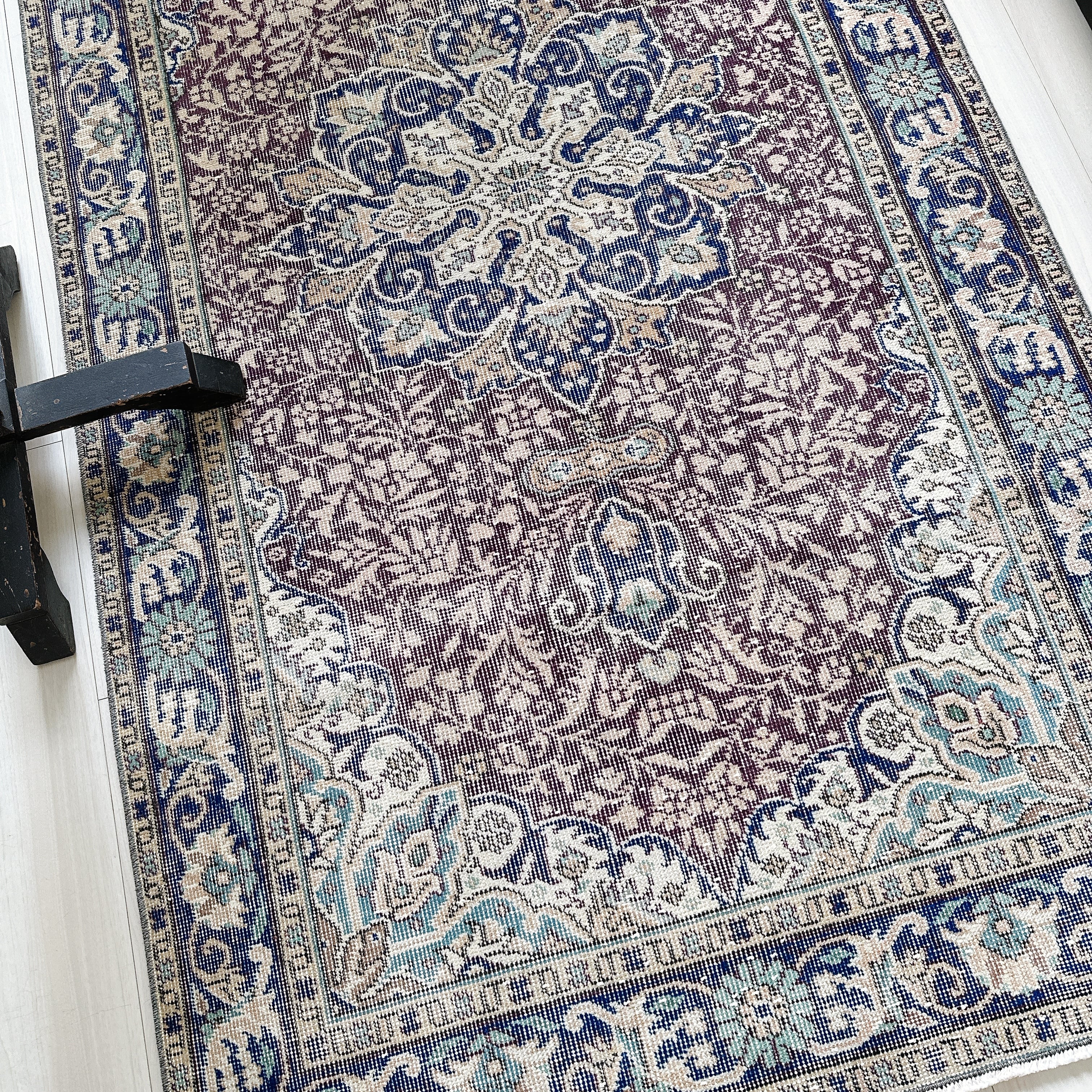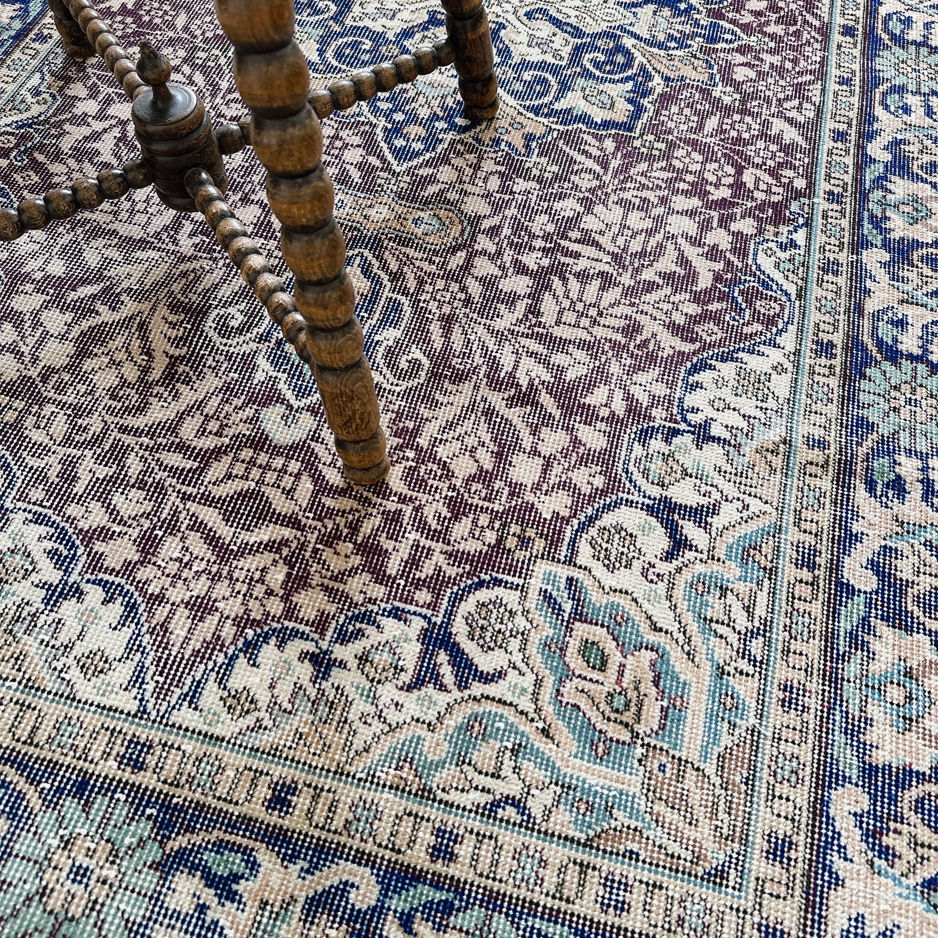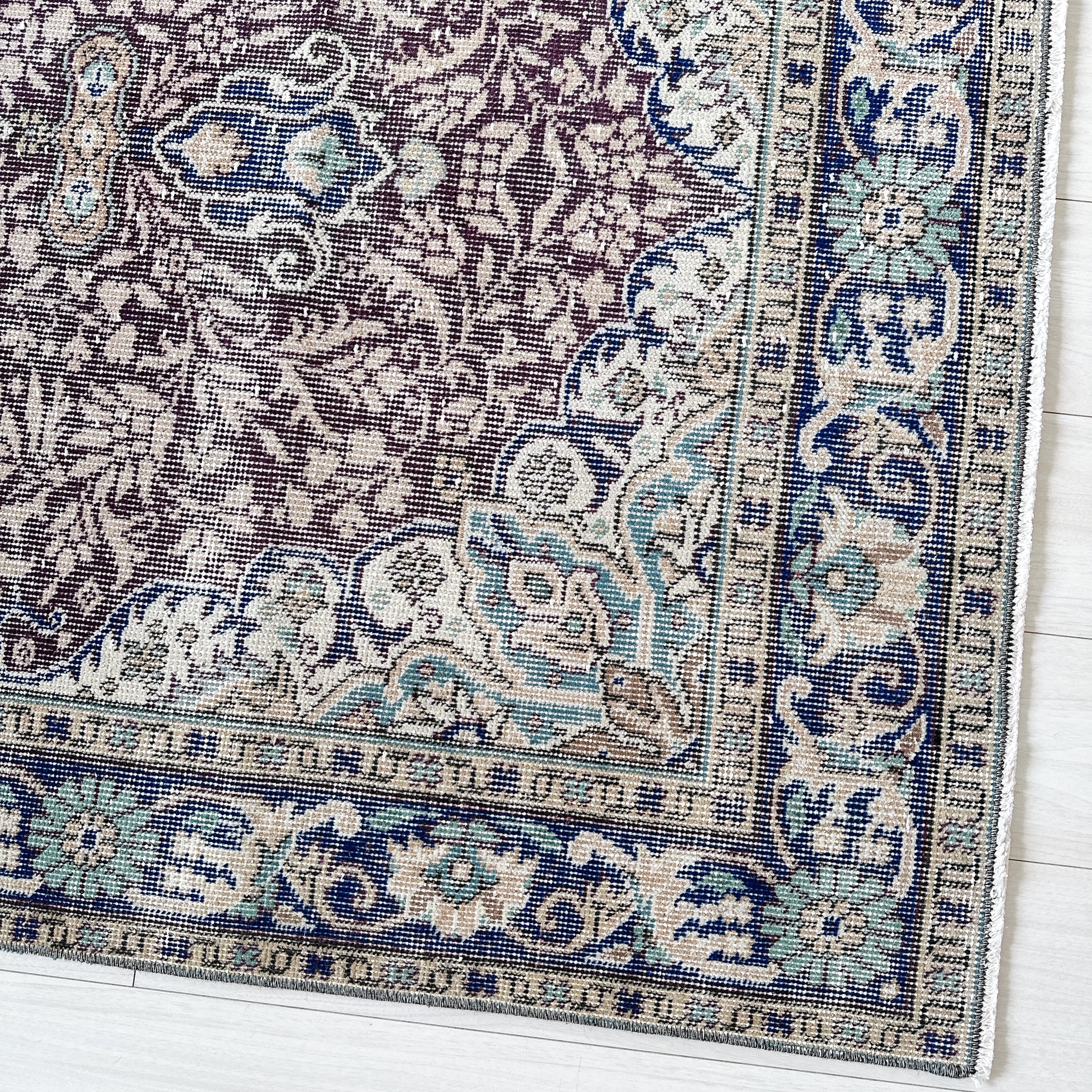 ダークバーガンディのフィールドに、ネイビーのメダリオンとボーダー(縁取り)が重なり、落ち着いた色調の中に程よい深みを添えています。