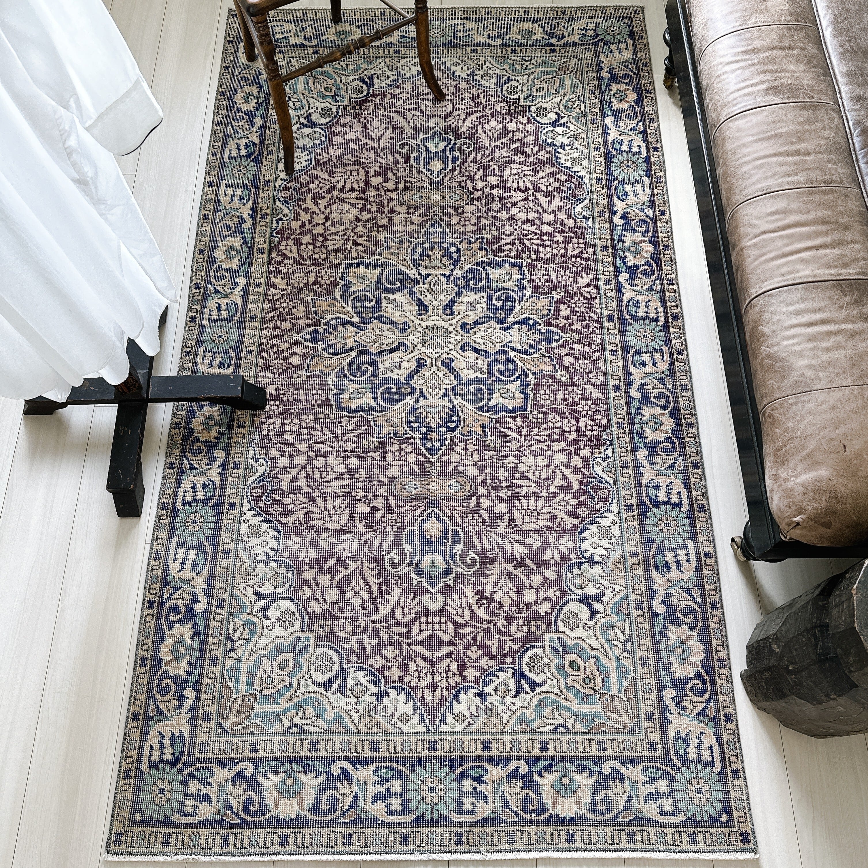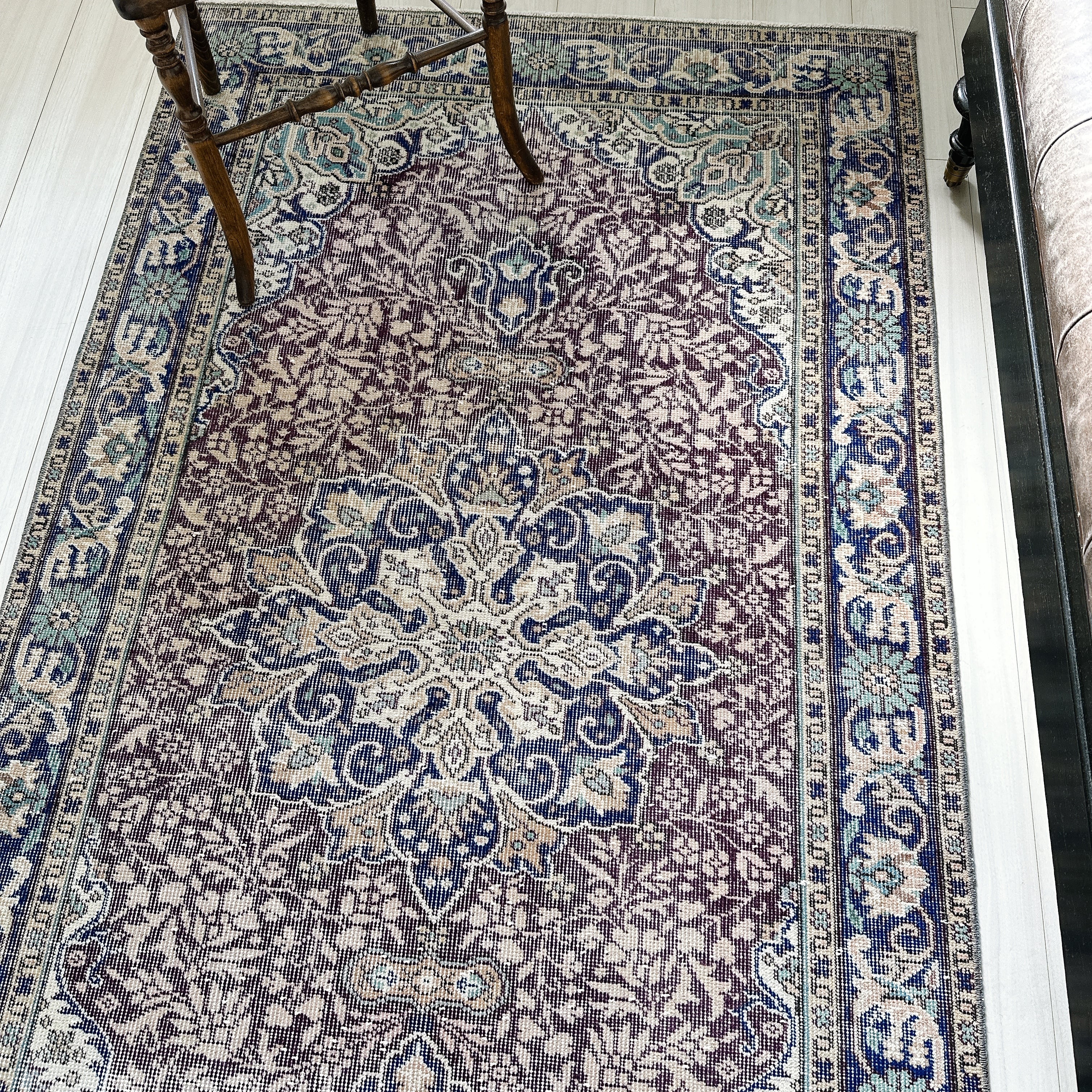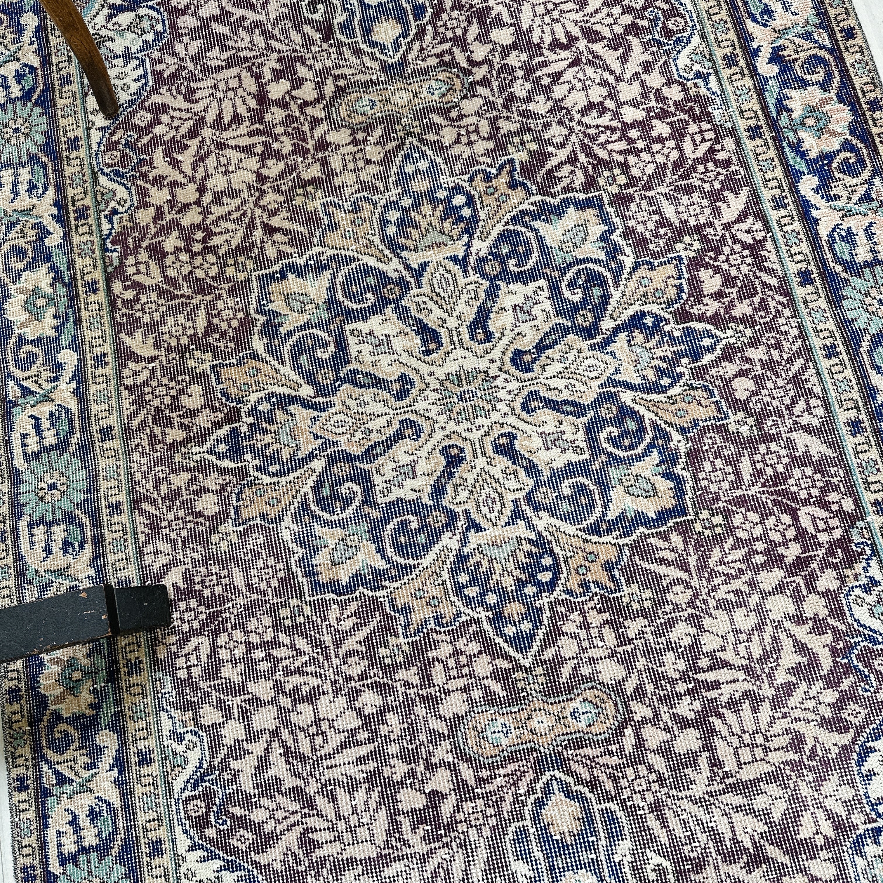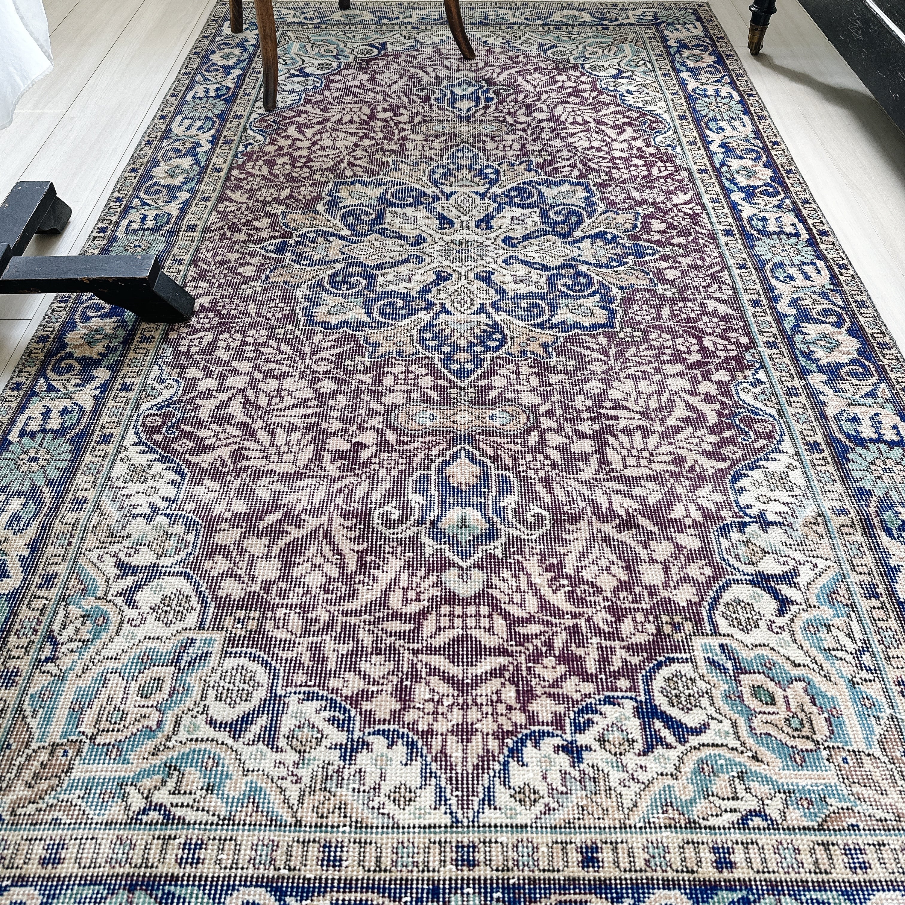 ダークバーガンディのフィールドに、ネイビーのメダリオンとボーダー(縁取り)が重なり、落ち着いた色調の中に程よい深みを添えています。